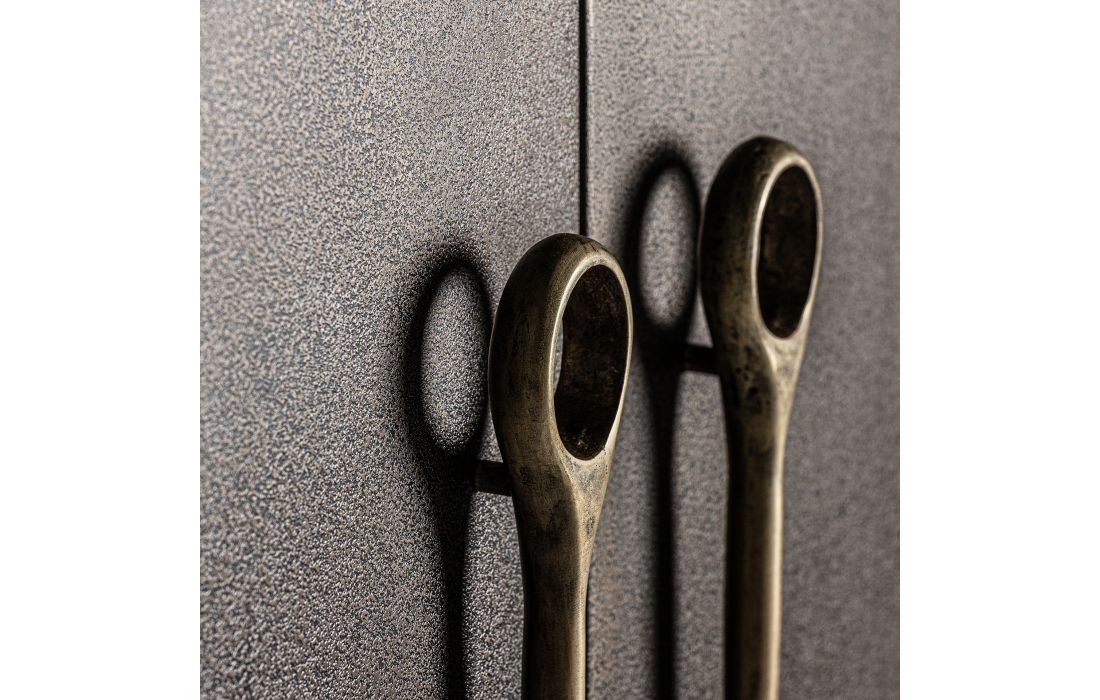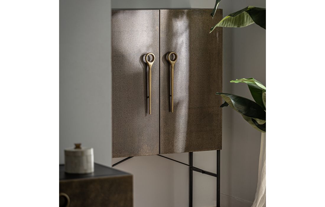 Móvel de bar com 2 portas e uma parteleira interior, feito em ferro , com acabamento na estrutura em dourado envelhecido e os pés em preto mate .