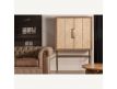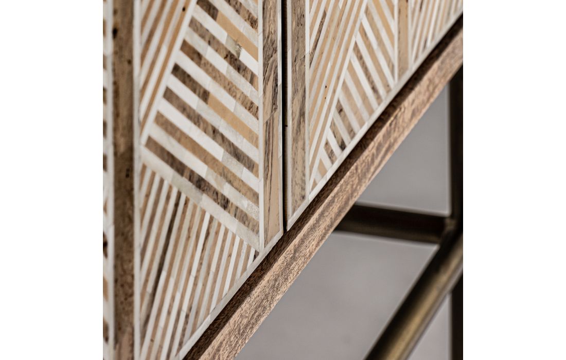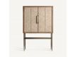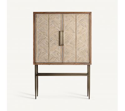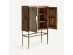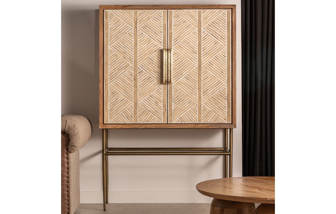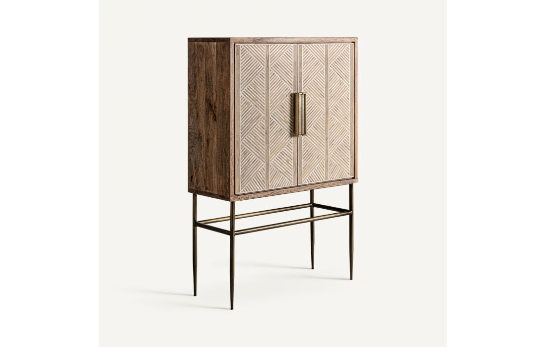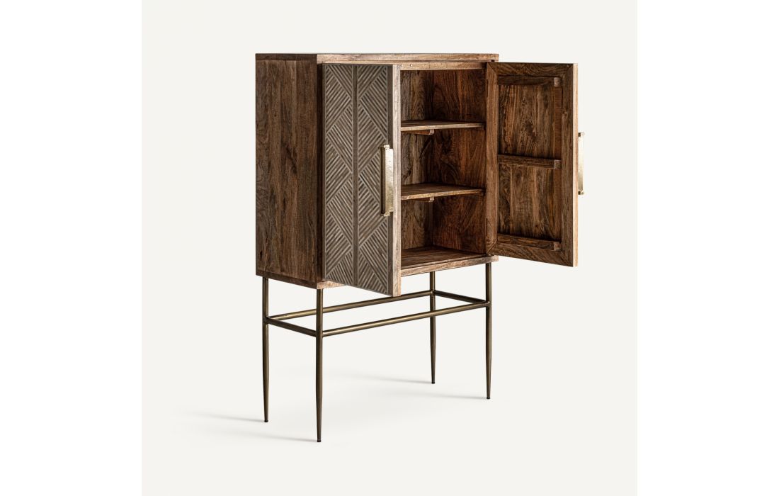 Móvel de bar com 2 portas e uma parteleira interior, feito em madeira de mango combinado com puxadores ferro dourado e os pés em dourado envelhecido .