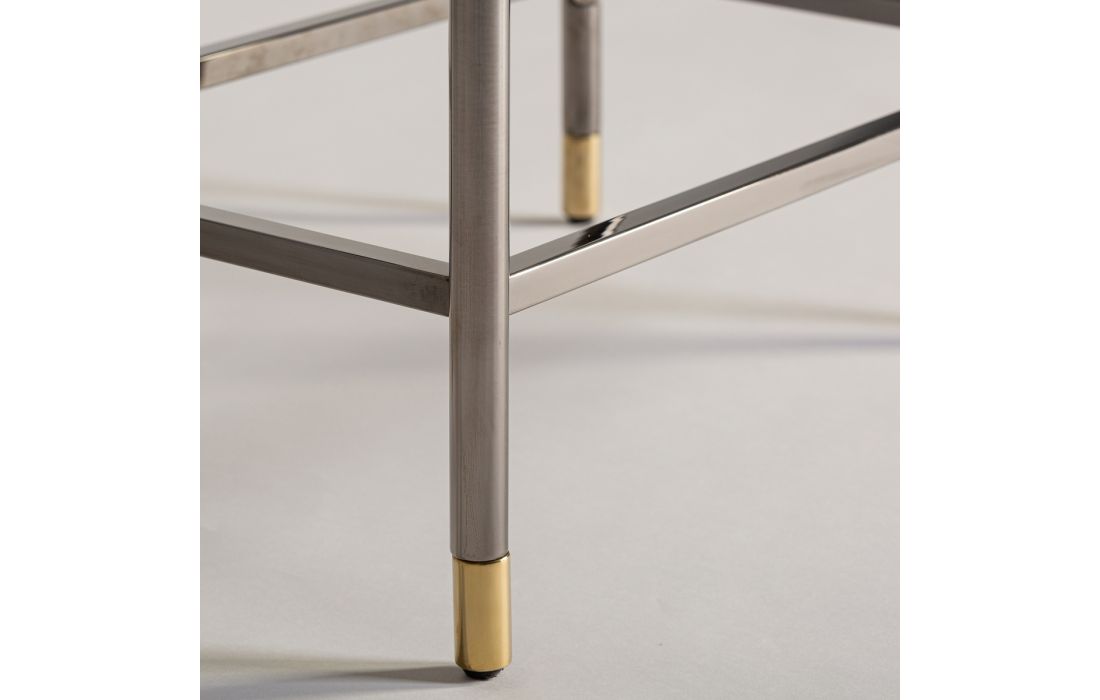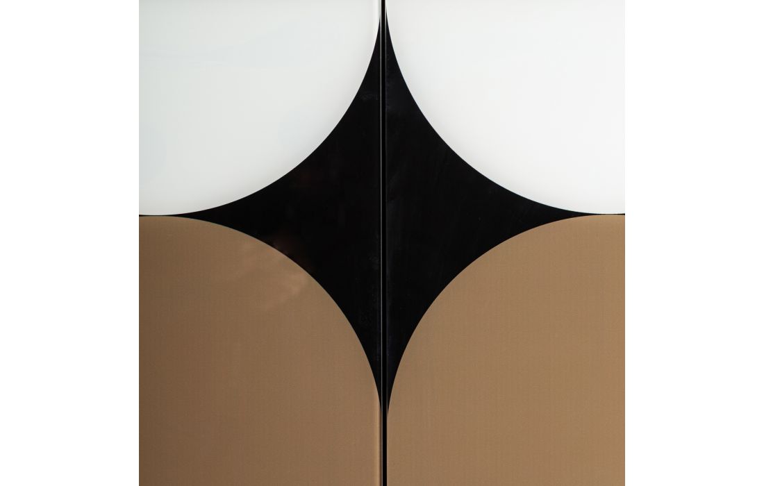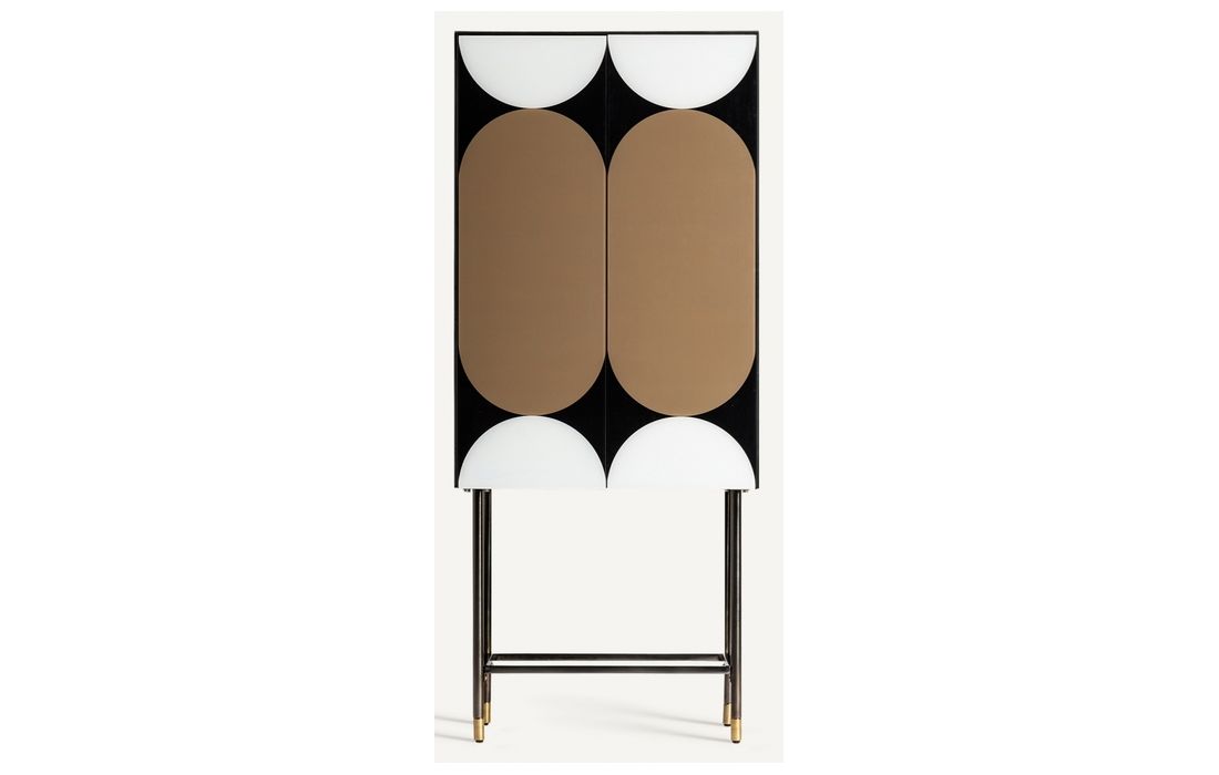 Móvel de bar feito em madeira dm com prateleiras em vidro onde predominam os tons escuros como preto e marrom e, onde, o branco se encarrega de dar aquele toque de luz nas peças que compõem a coleção. Com os pés em metal com promenor de copo dourado.