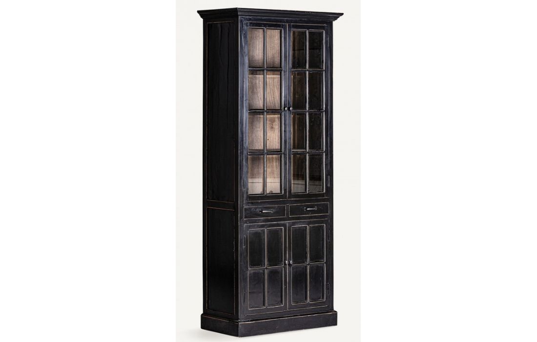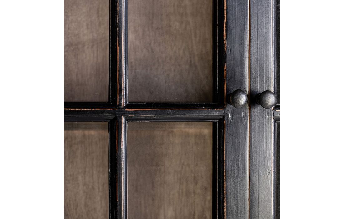 Vitrine no estilo provençal confeccionada em madeira de olmo na cor preta combinada com vidro