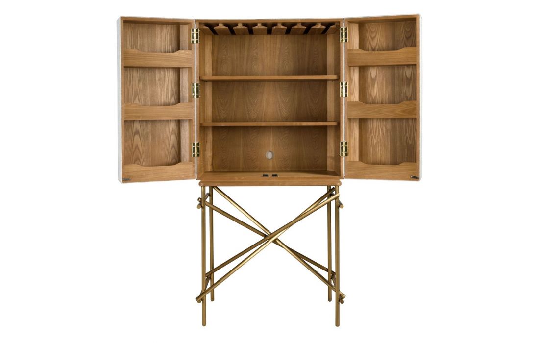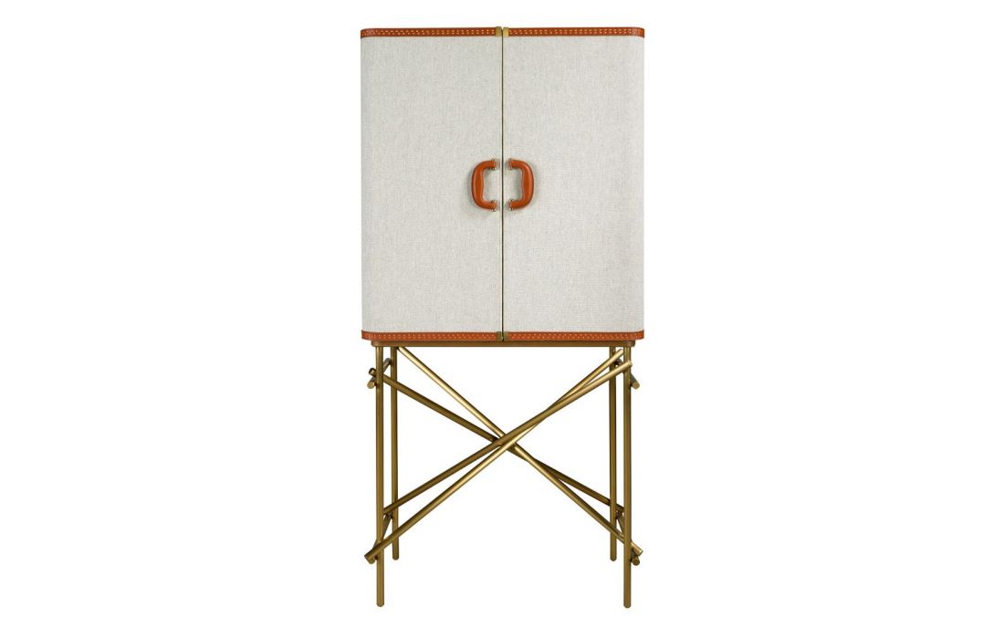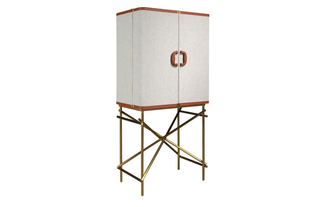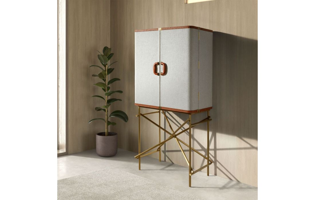 Aparador alto de design moderno com estrutura em MDF de nogueira natural, estofado em tecido e pernas em aço inoxidável com os seus detalhes em pele de bovino e 2 portasDestinatário :