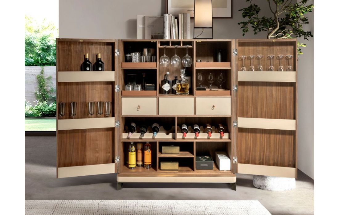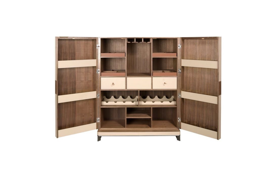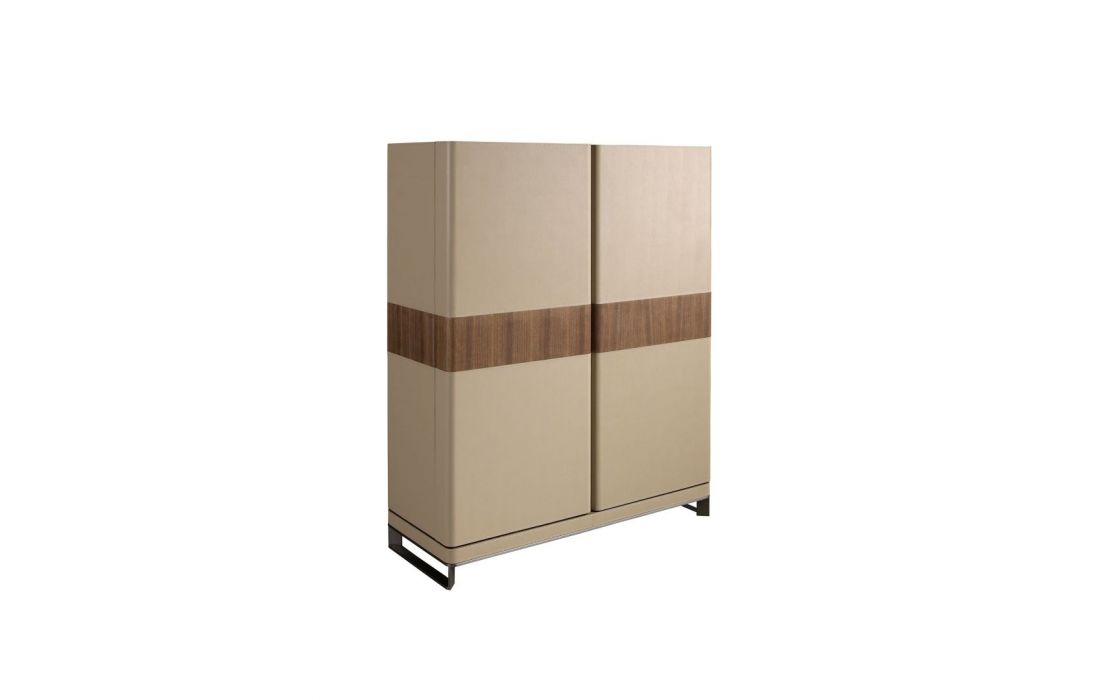 Aparador alto de design moderno com estrutura em MDF de nogueira natural, estofado em pele de e pernas em aço inoxidável, com 3 gavetas e 2 portasDestinatário :