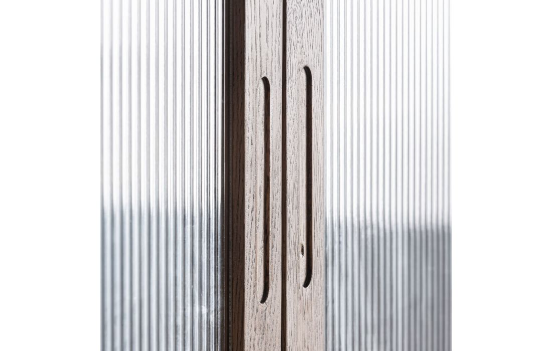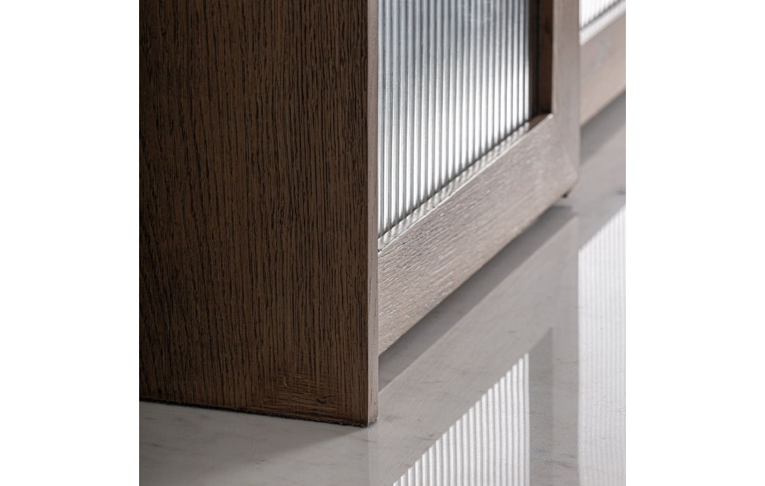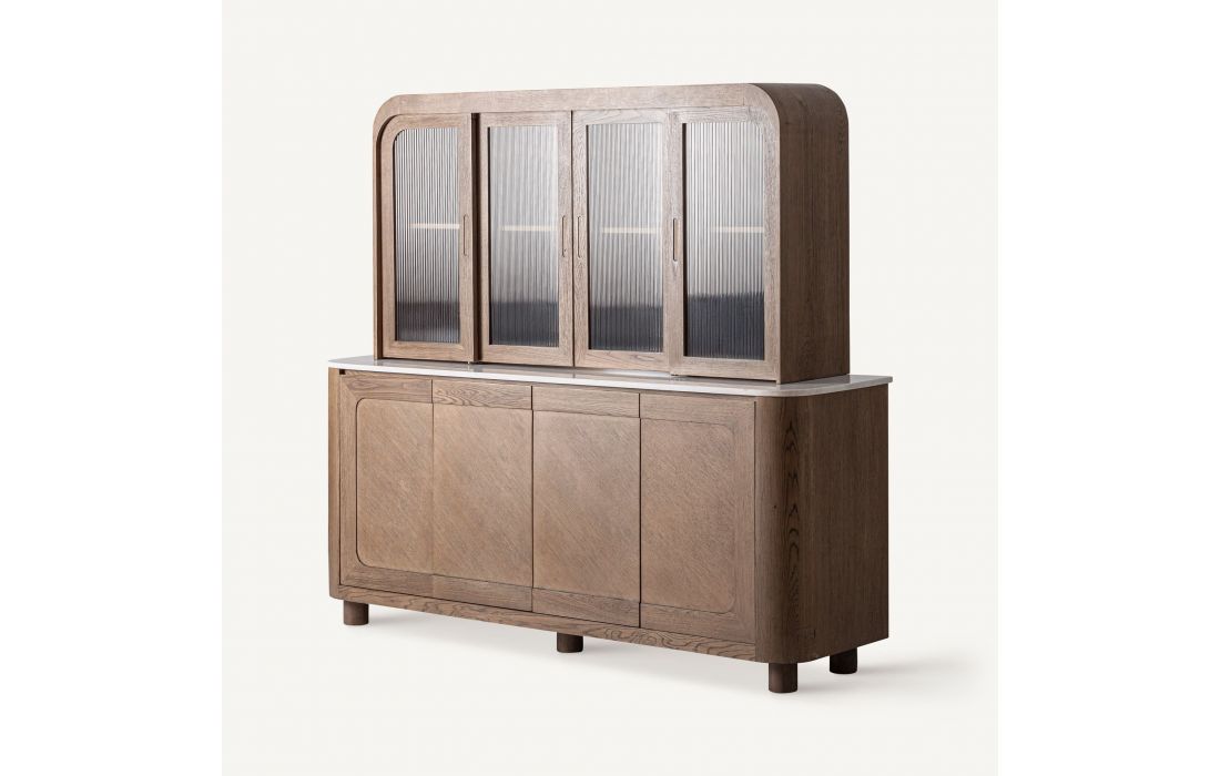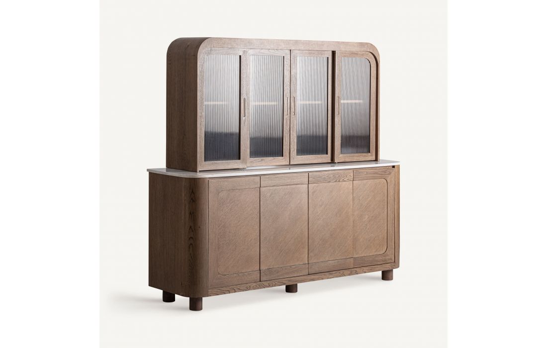 Este Móvel alto em estilo colonial, feito de madeira de carvalho, combinado com mármore em acabamento com veias e vidro transparente.