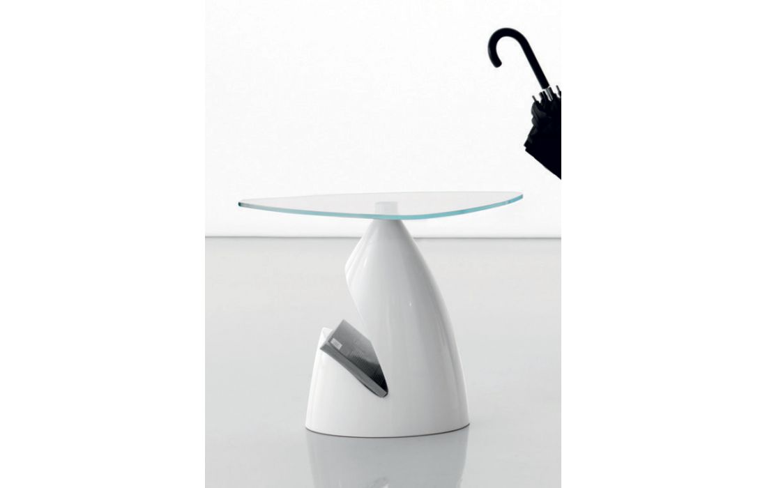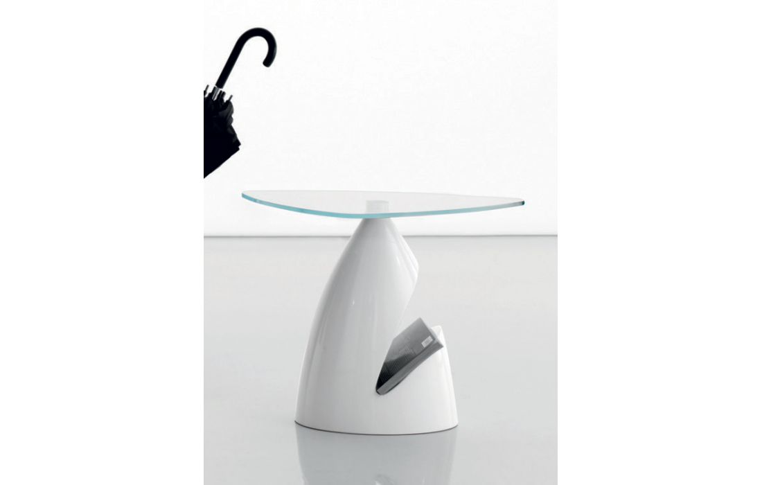 Mesa de apoio com base em poliuretano de cor branco brilho, creme claro ou cinza com tampo de vidro transparente extraclaro