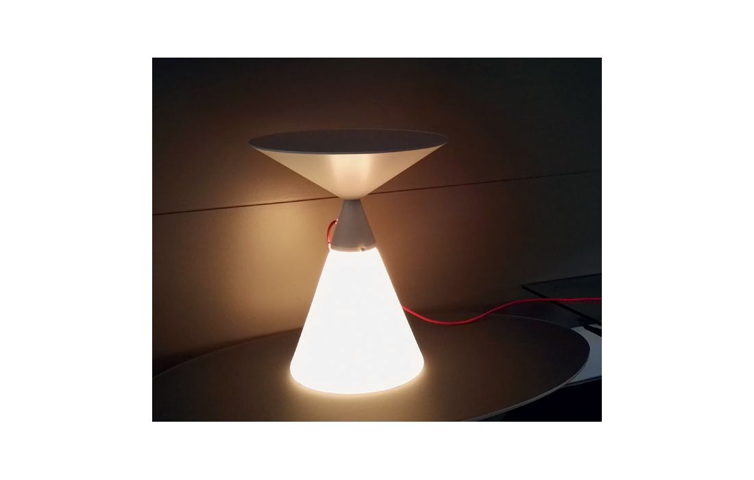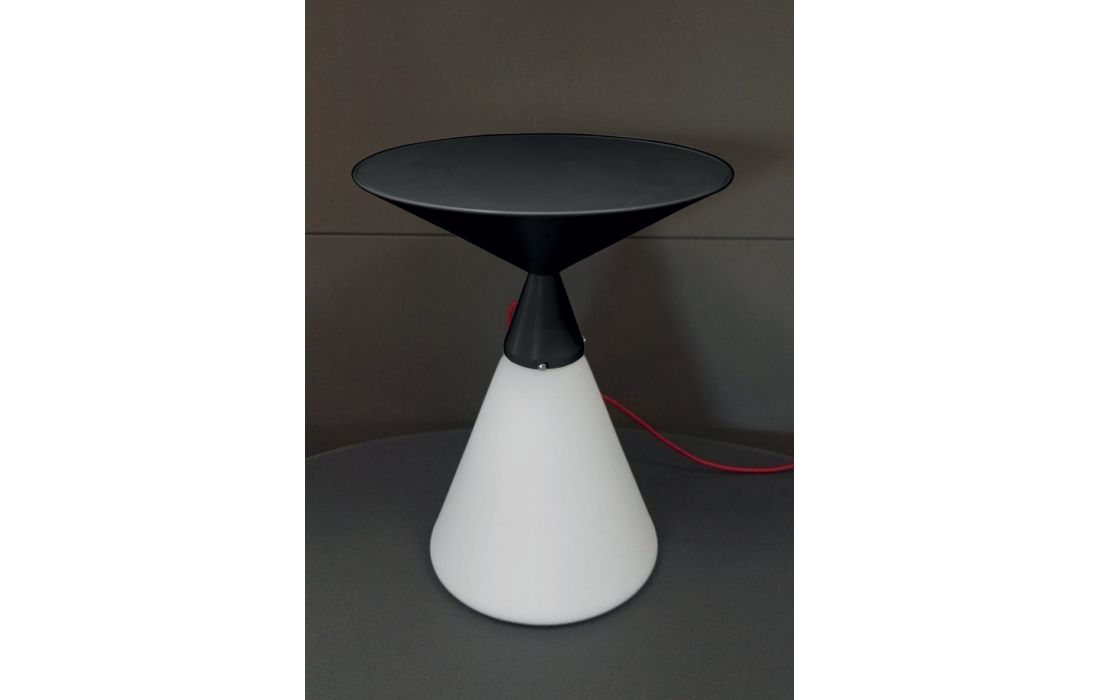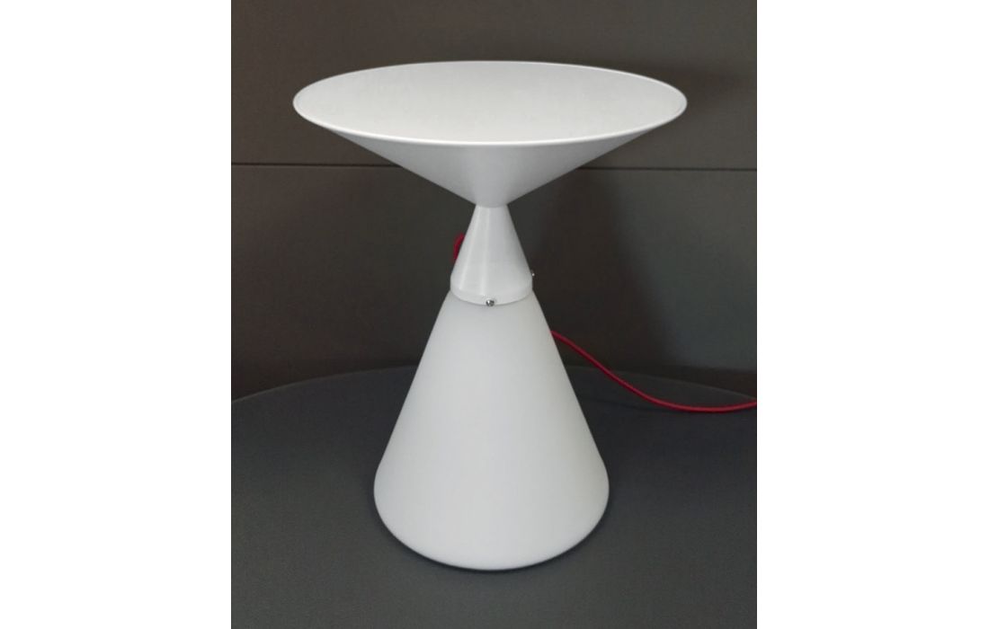 Mesa de apoio redonda com estrutura em metal de cor branco, preto ou vermelho com base em vidro fosco branco com luz interior e cabo electrico em vermelho