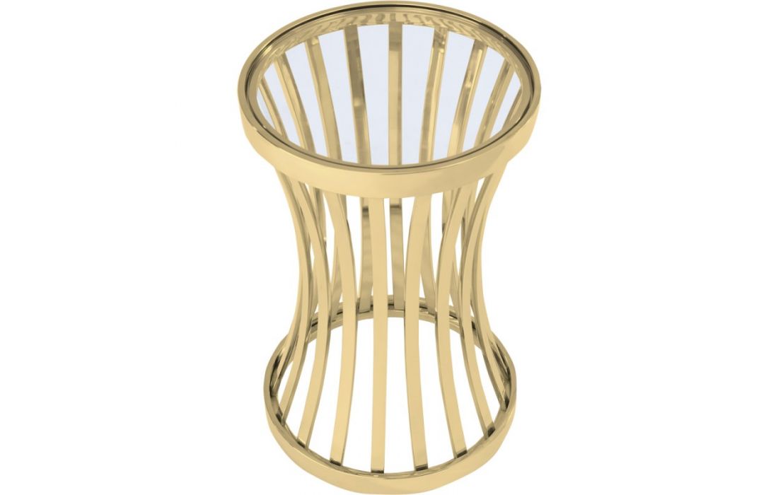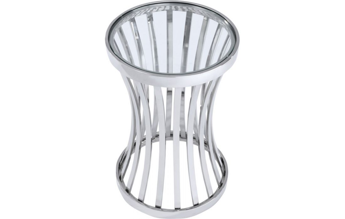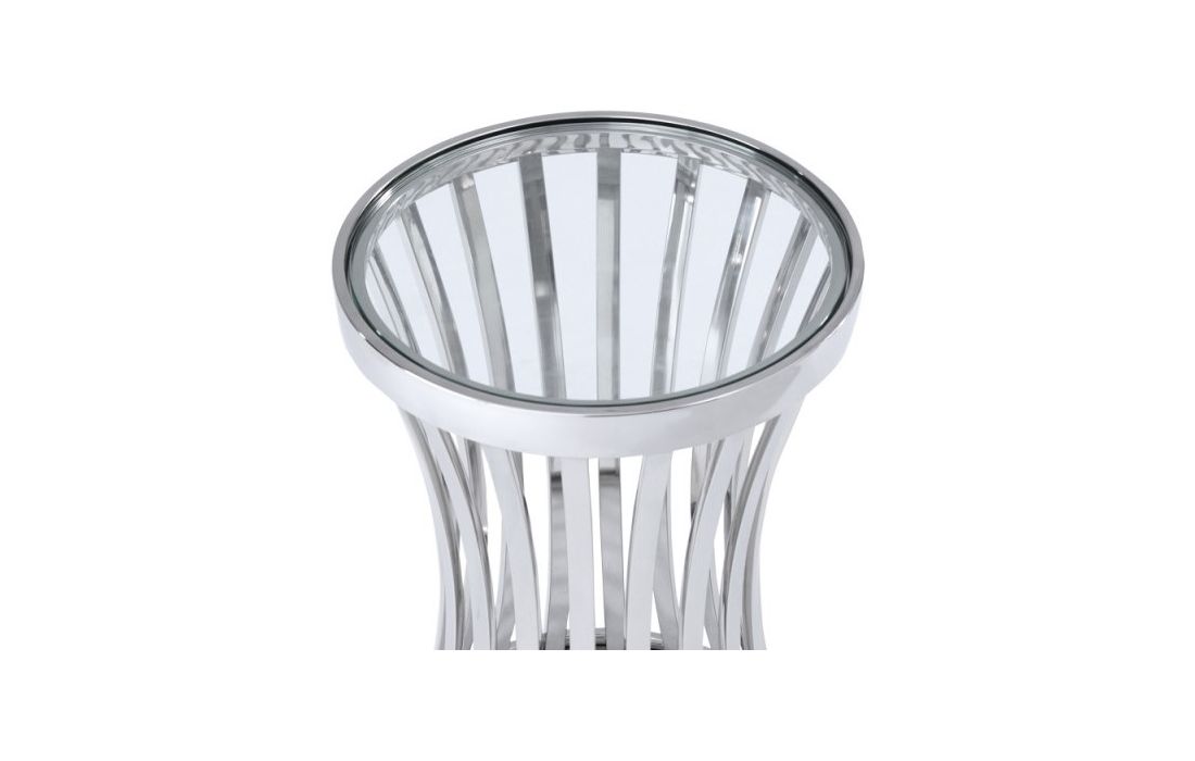 Mesa de apoio com estrutura em aço inox e tampo em vidro.