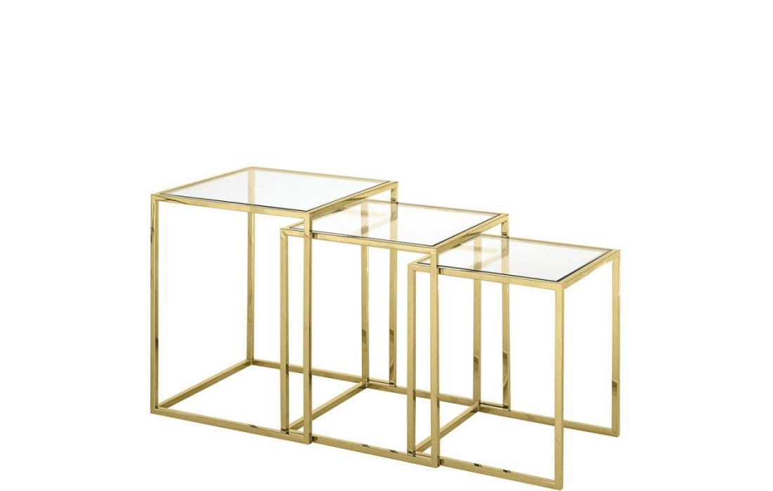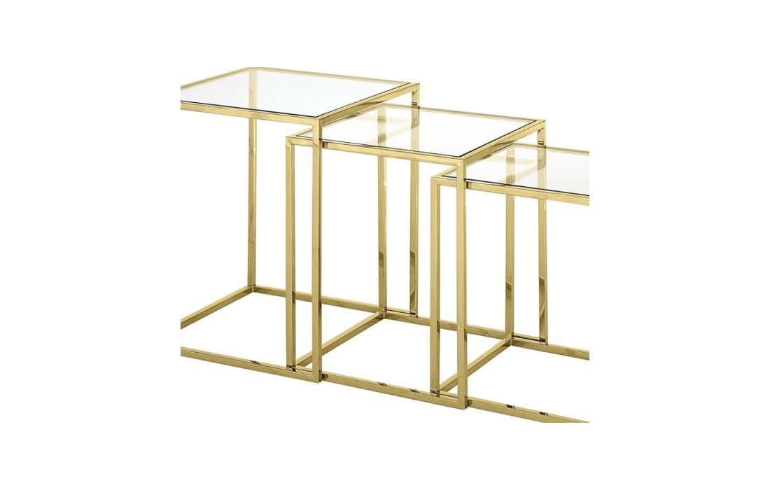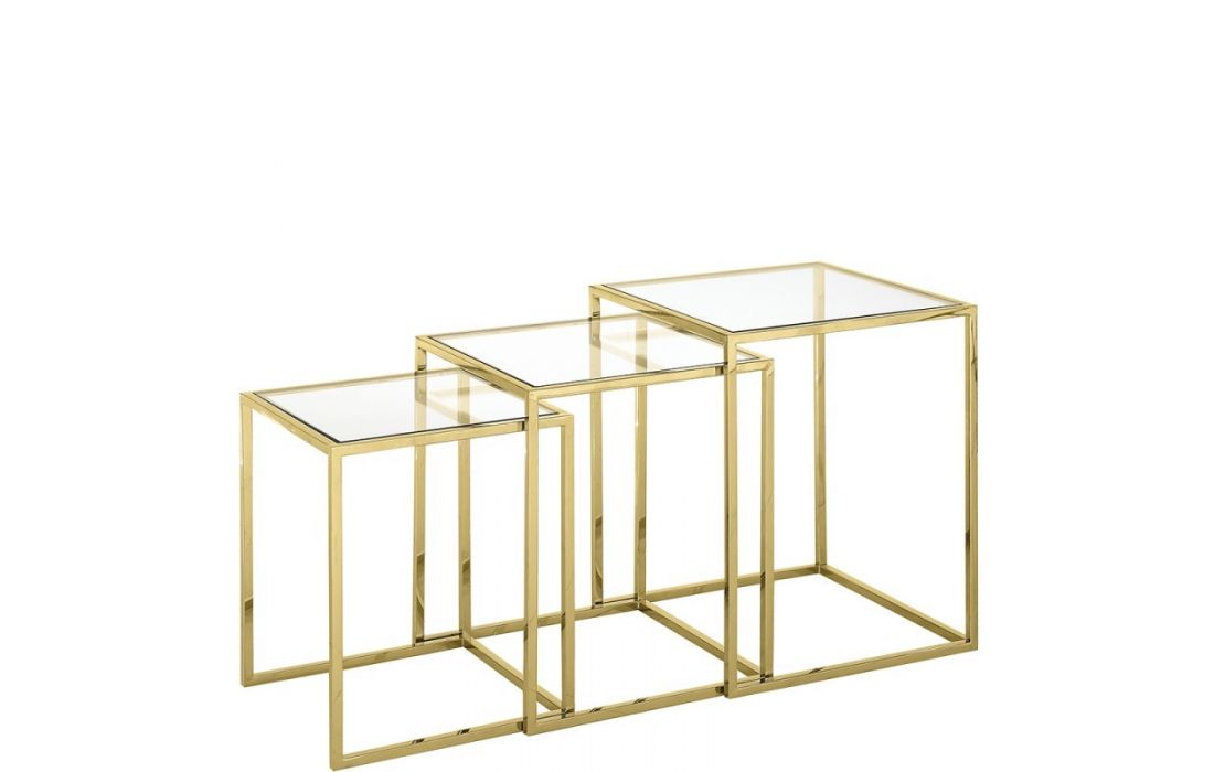 Set de 3 mesas de apoio com estrutura em aço inox e tampo em vidro.