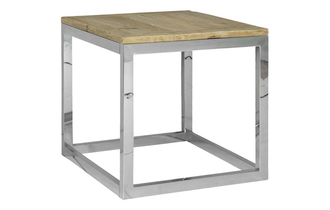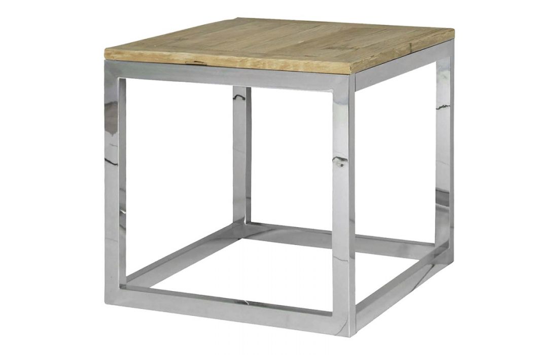 Mesa de apoio com estrutura em metal e tampo em madeira.