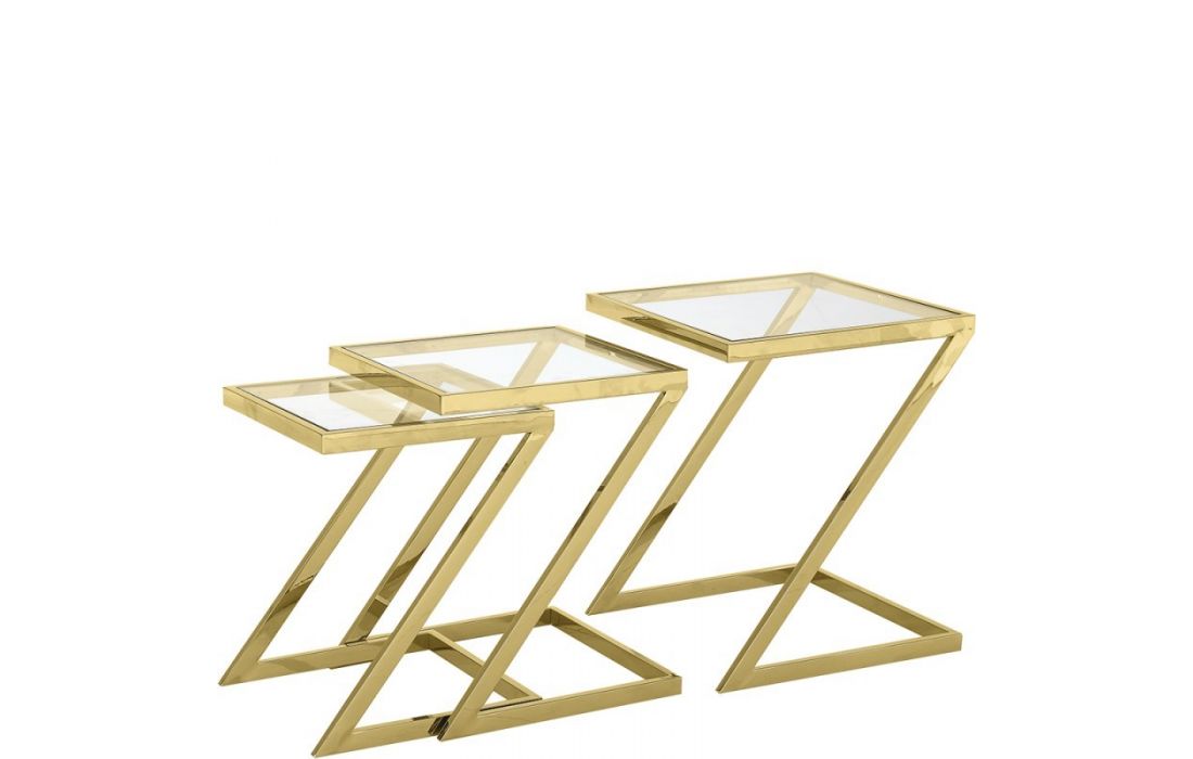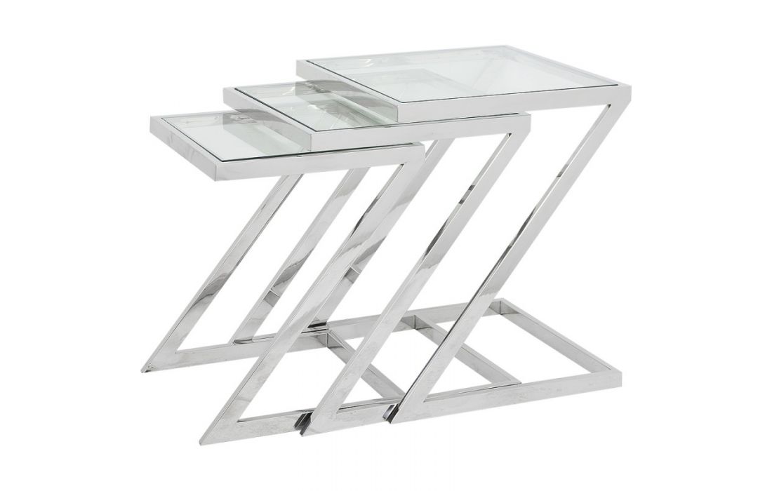 Set de 3 mesas de apoio com estrutura em aço inox e tampo em vidro.
