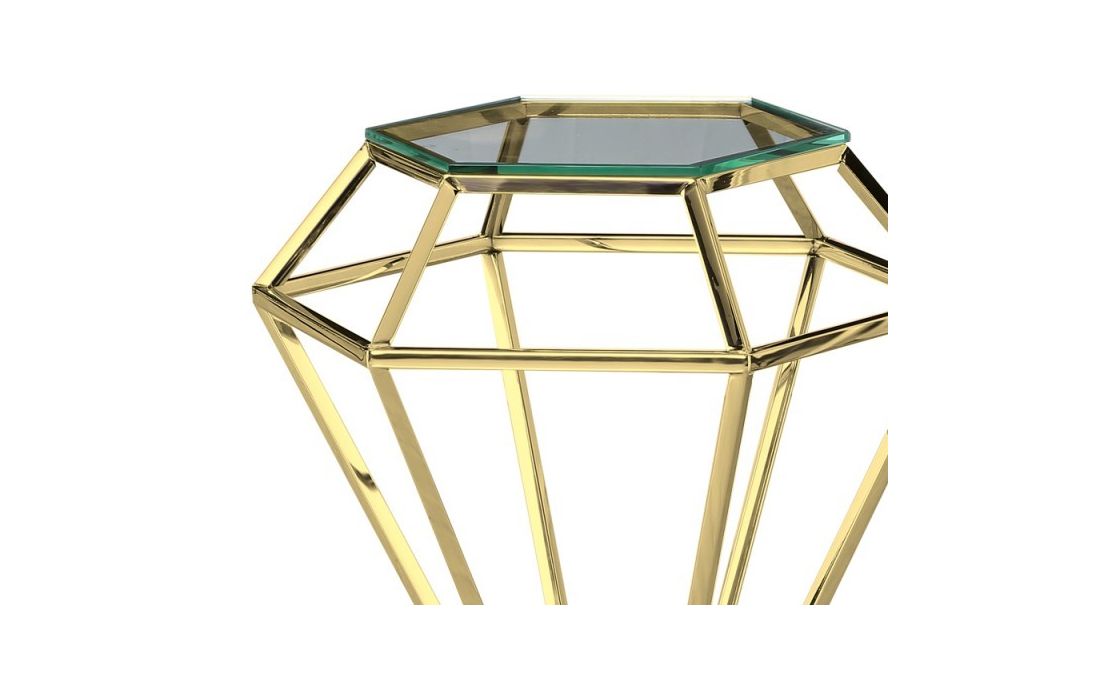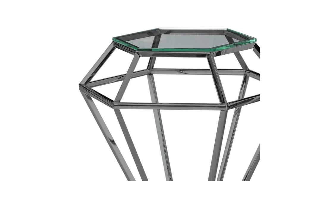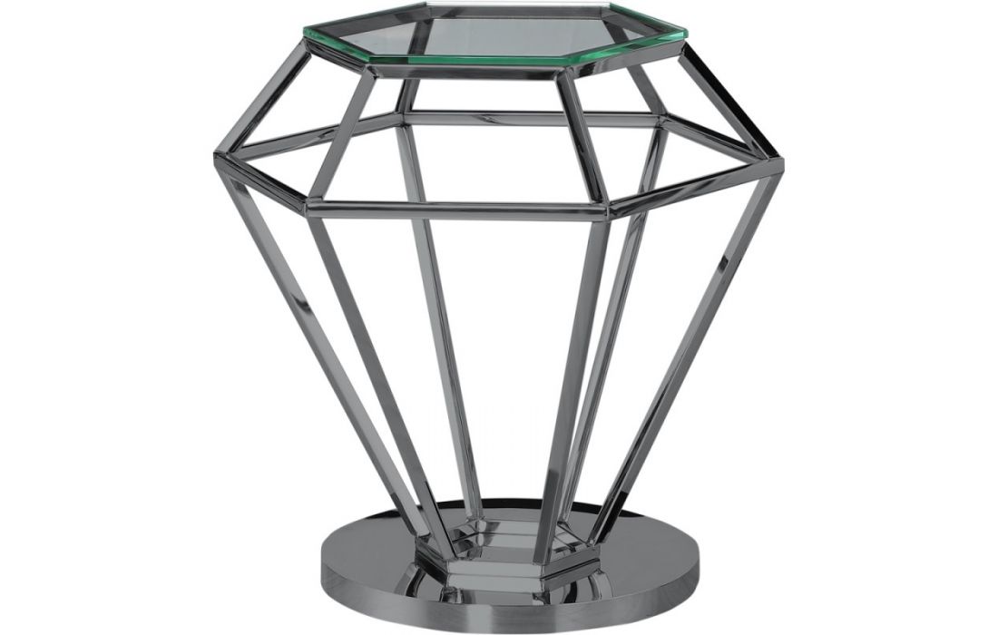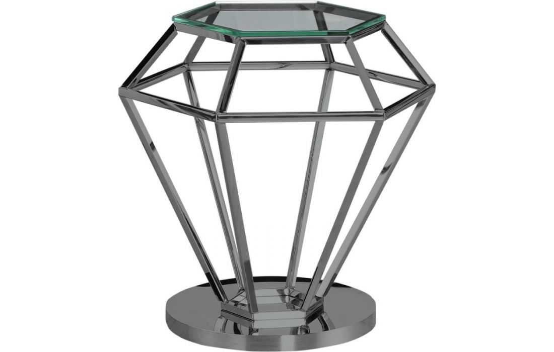 Mesa de apoio com estrutura em aço inox e tampo em vidro.