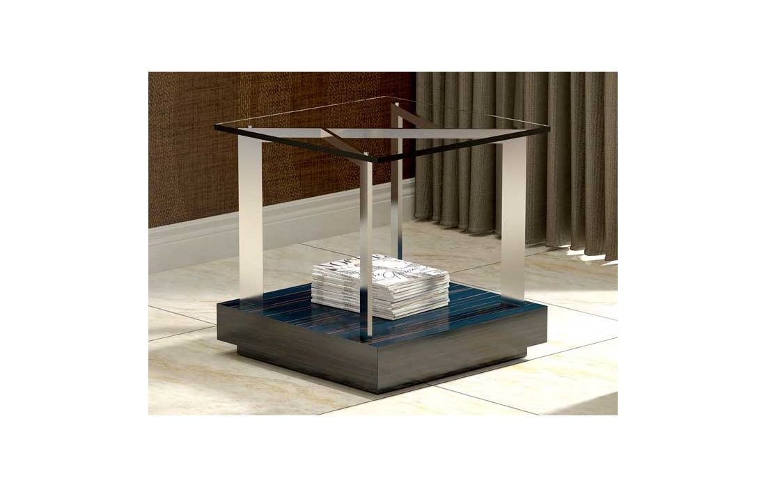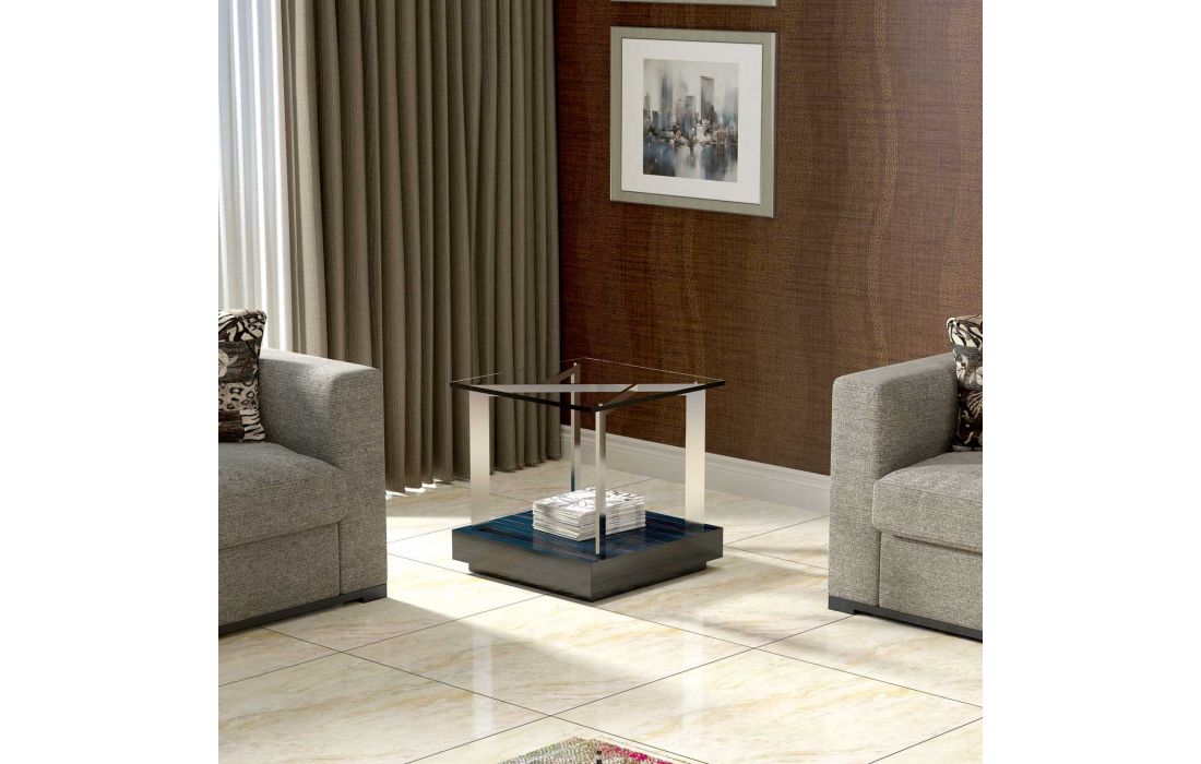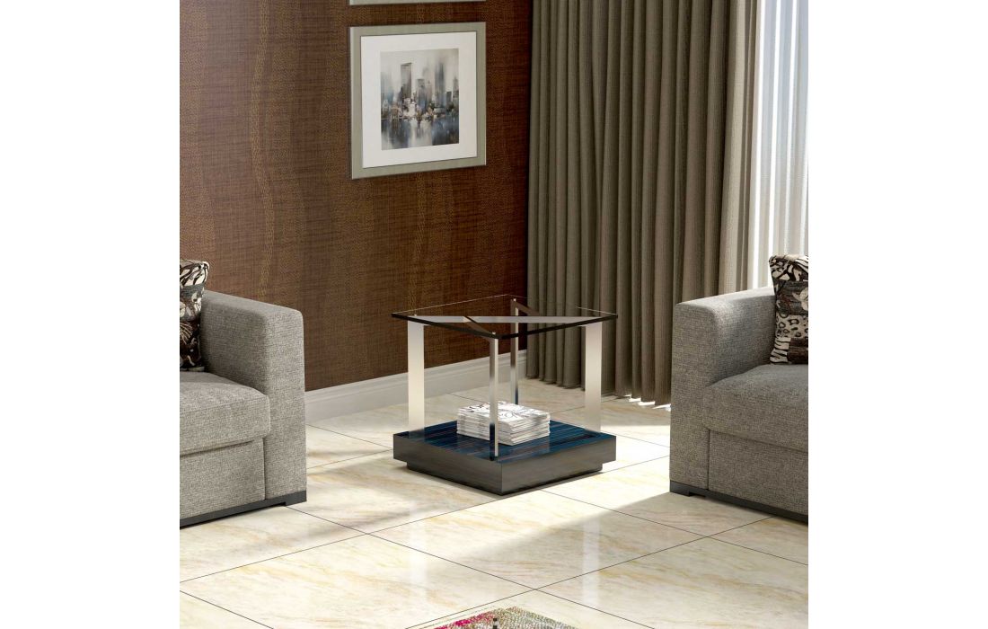 Mesa de apoio com tampo de vidro e pormenor metálico