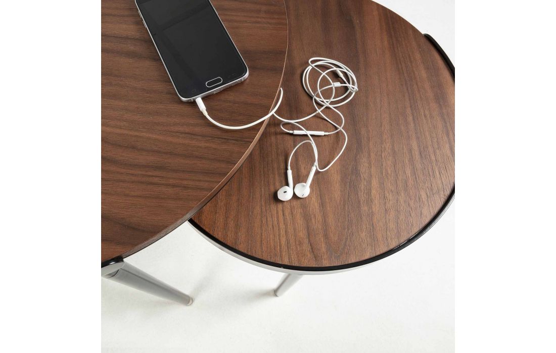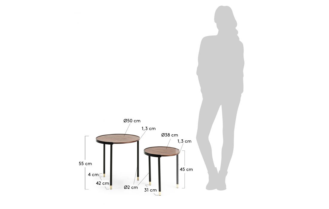 Conjunto 2 mesas de apoio com estrutura em metal de cor preta e tampo em nogueira.