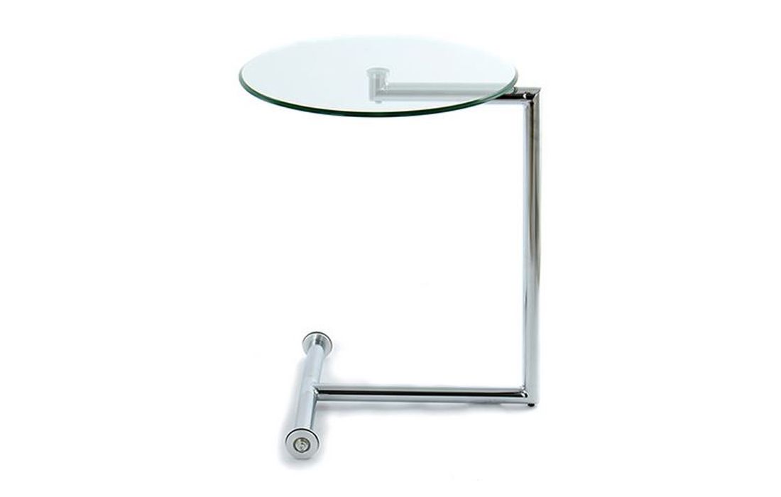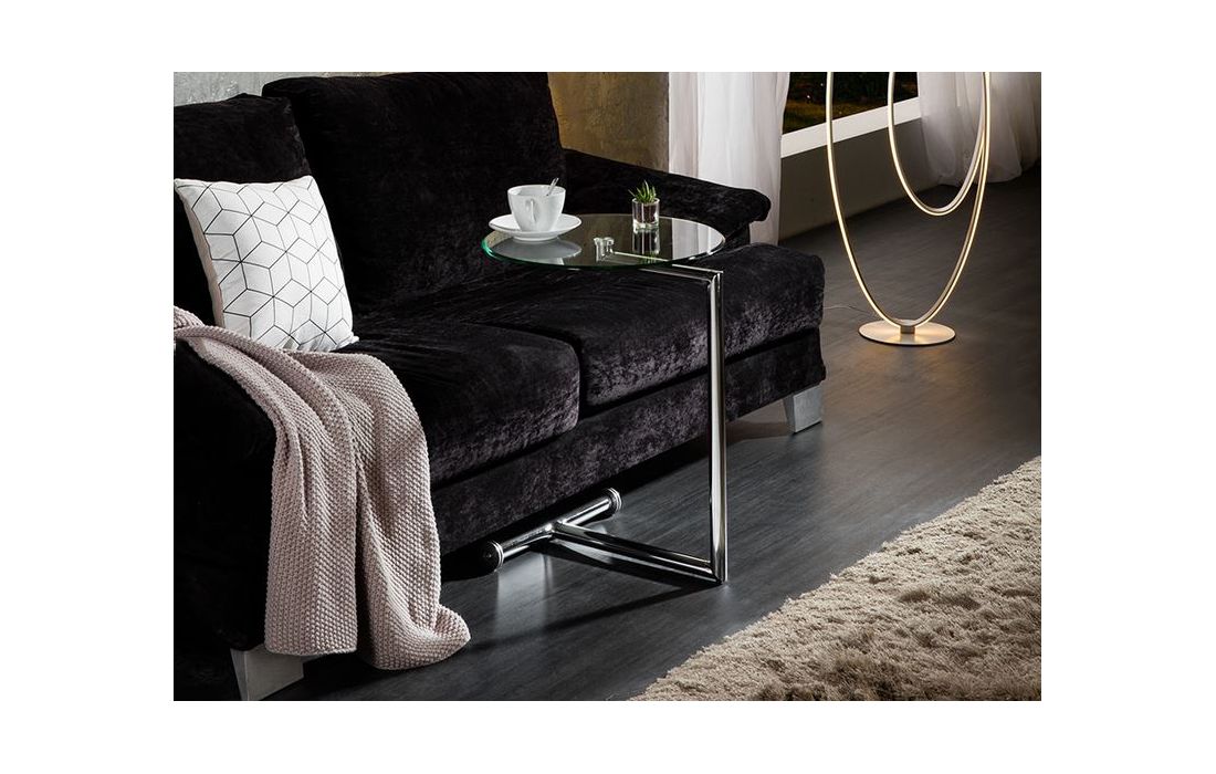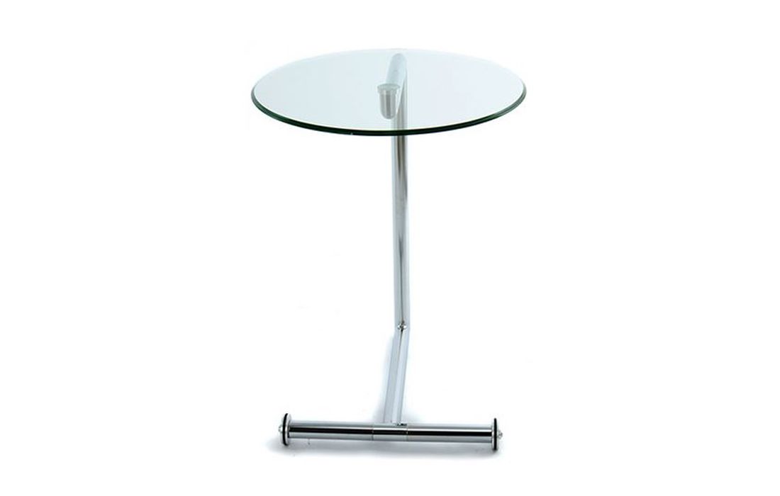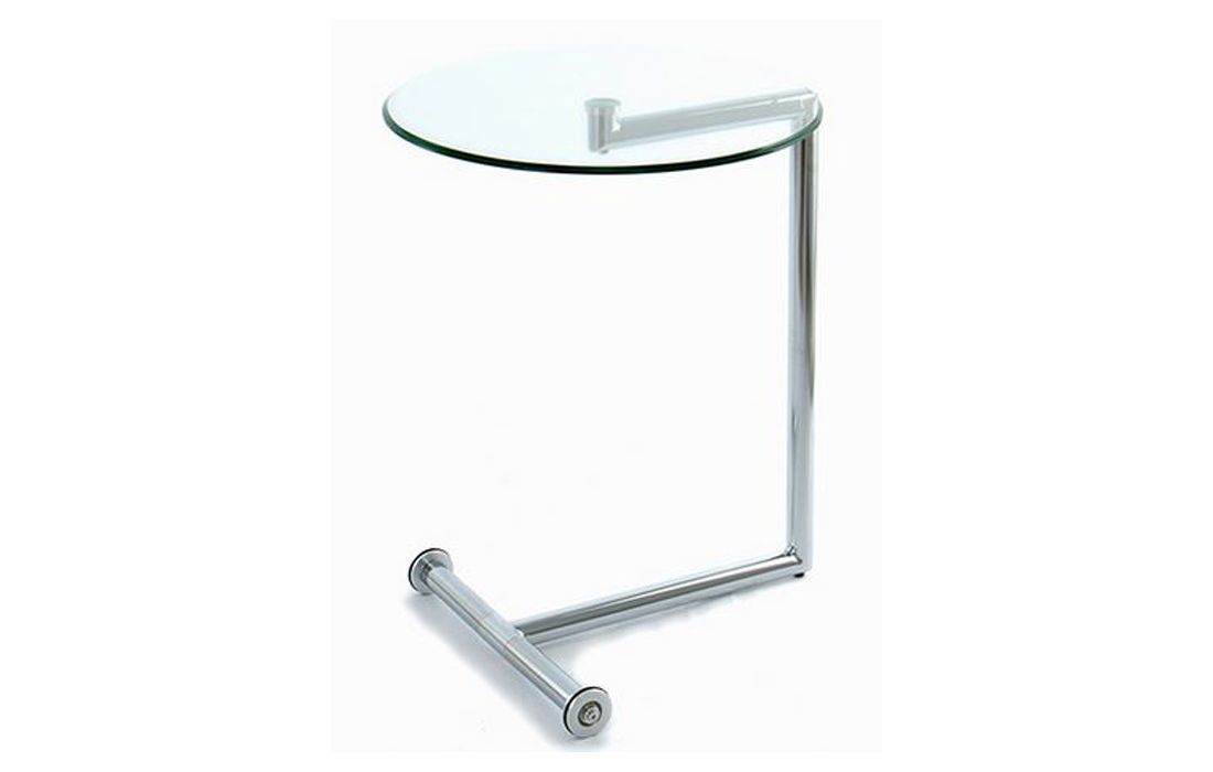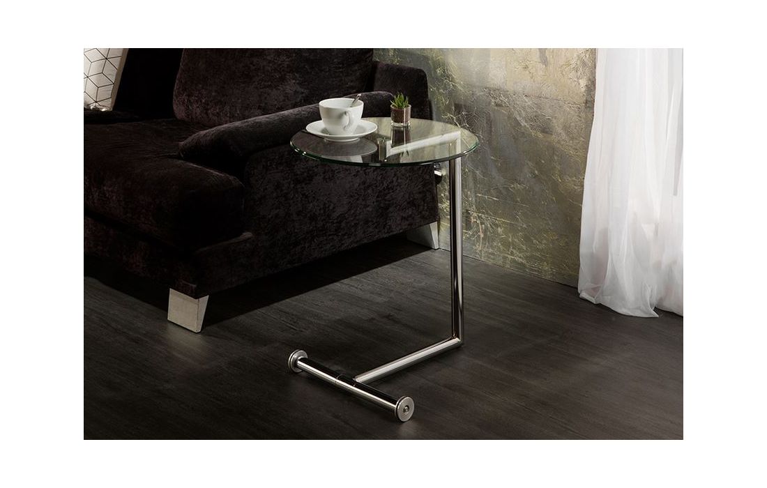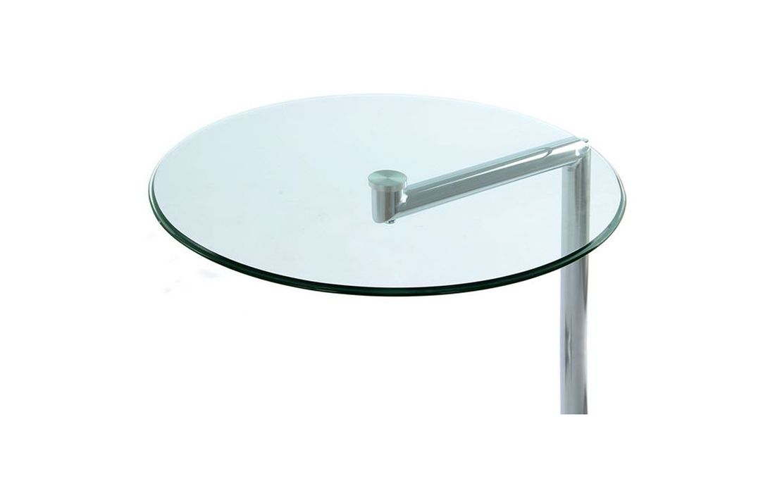Mesa de apoio redonda com rodas, em metal cromado. Tampo de vidro temperado de 8 mm.