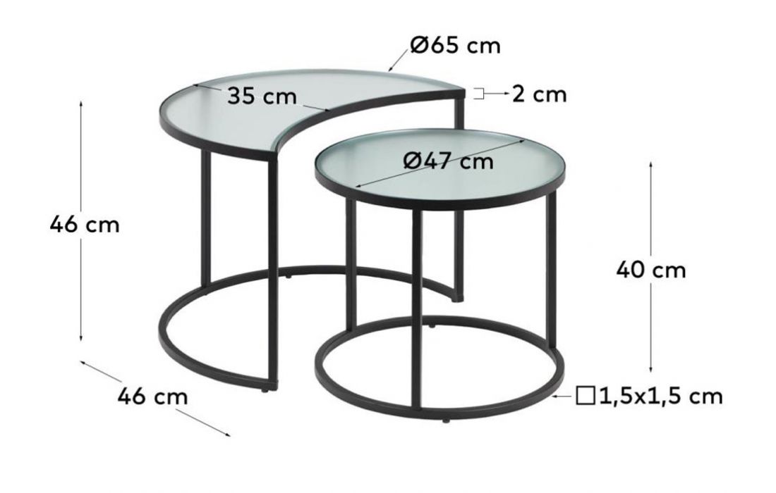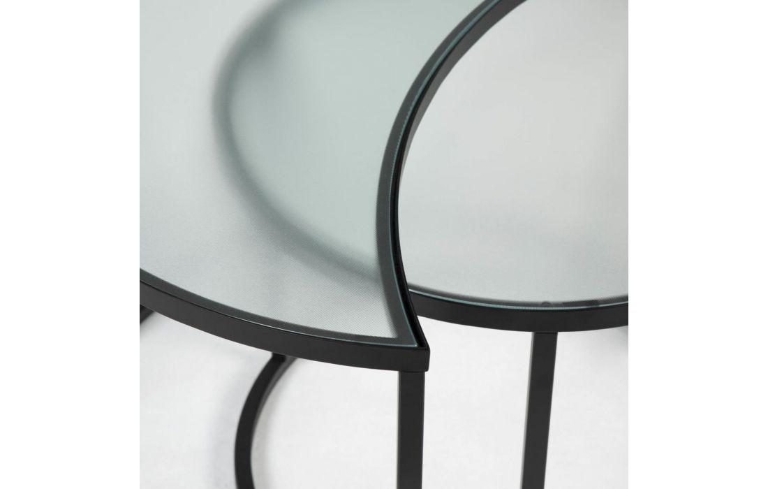 Conjunto de 2 mesas de apoio feitas em aço de cor preto e tampo de vidro temperado.