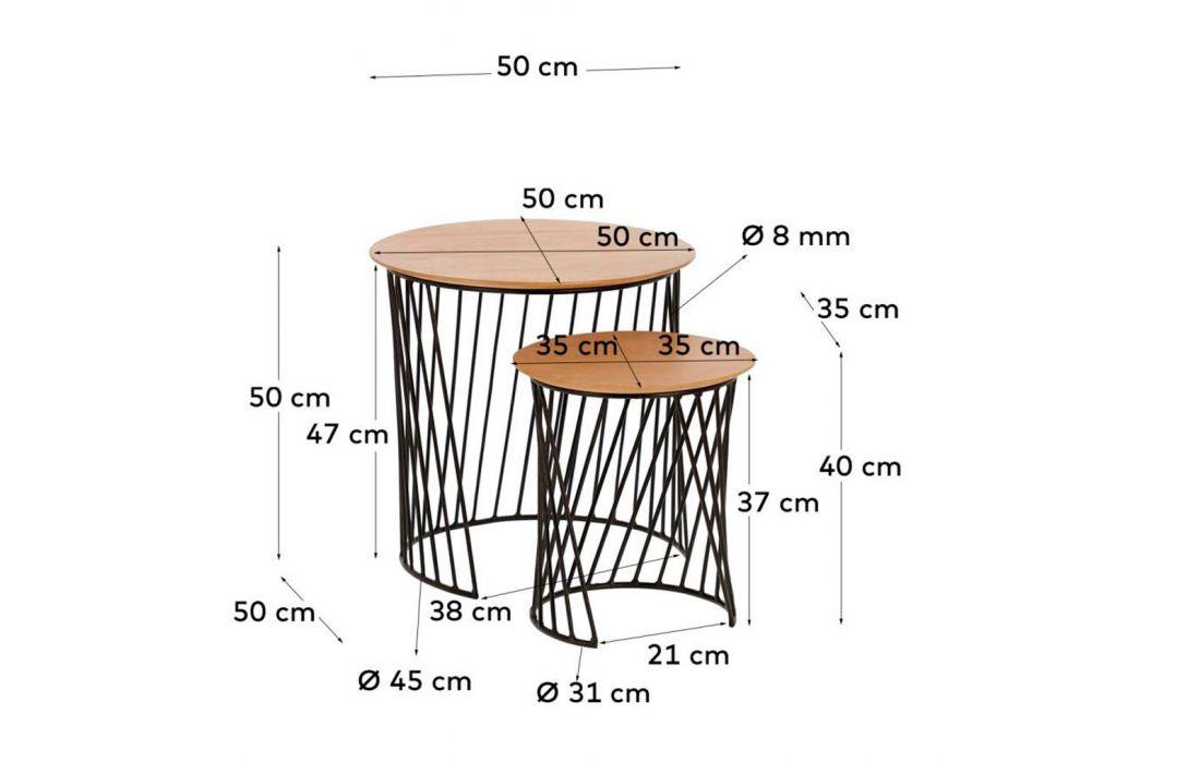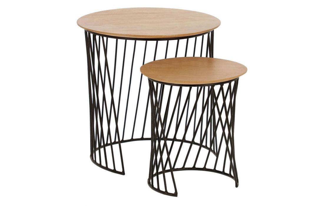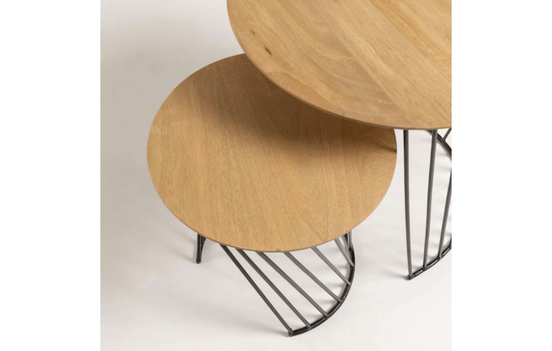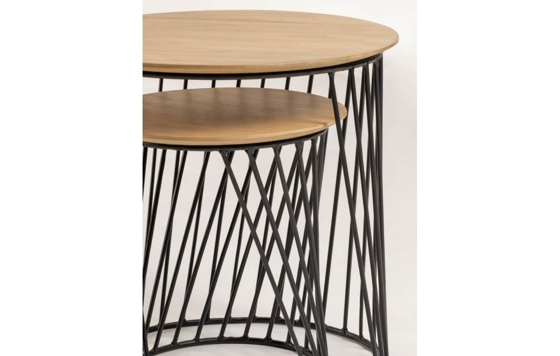 Conjunto de 2 mesas de apoio feitas em madeira maciça de manga com uma estrutura de metal, com acabamento em preto fosco.