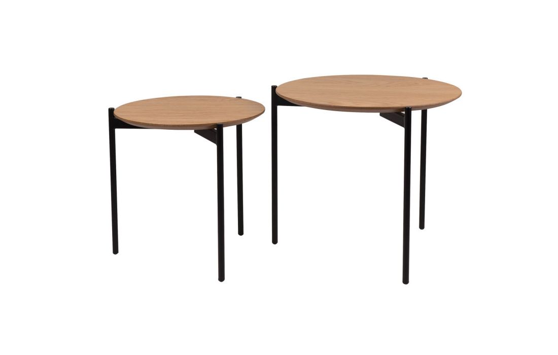 Conjunto de 2 mesas de apoio redondas em carvalho à cor natural e pés metálicos pretos