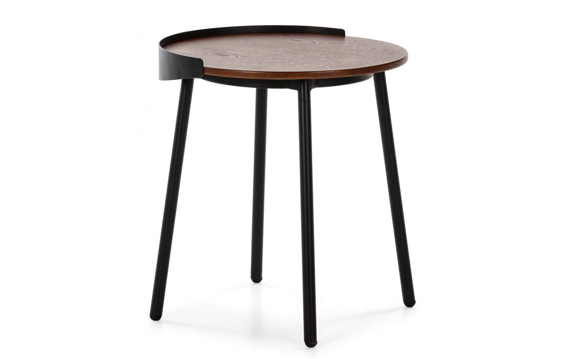Mesa de apoio com estrutura em metal cor preta e tampo em madeira.