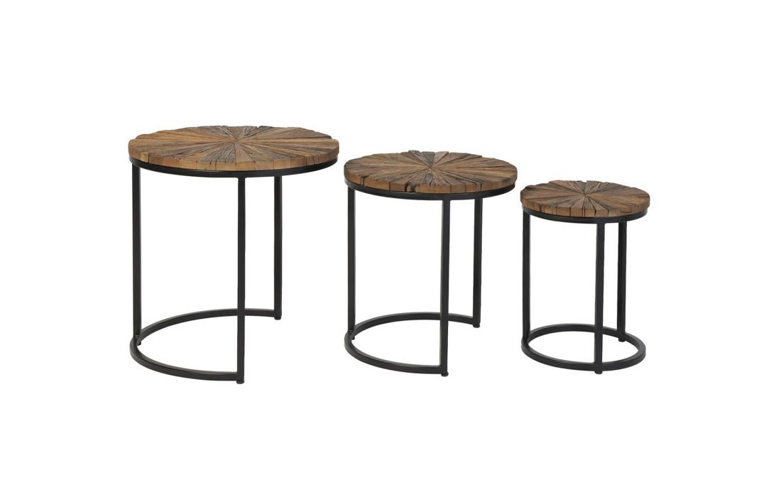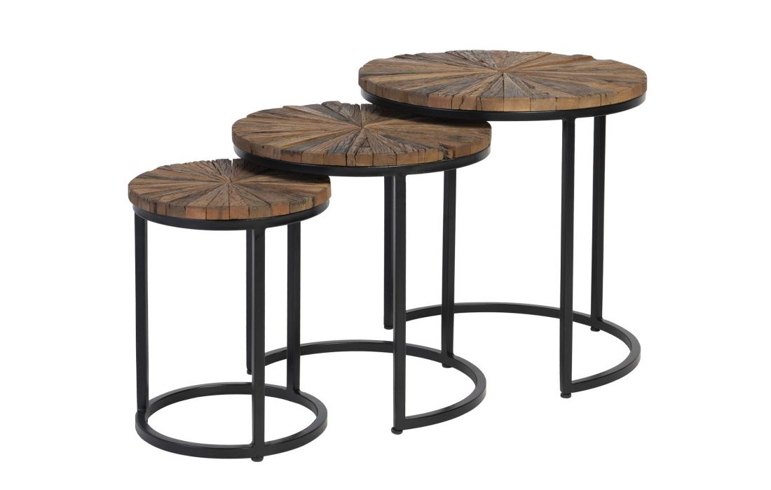 Conjunto de três mesas apoio redondas com tampo em madeira reciclada e estrutura em ferro lacado mate