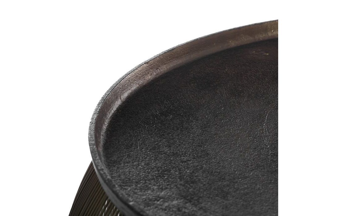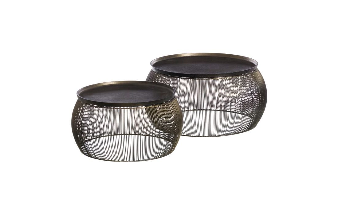 Conjunto de duas mesas apoio redondas com tampo em aluminio e base em ferro.