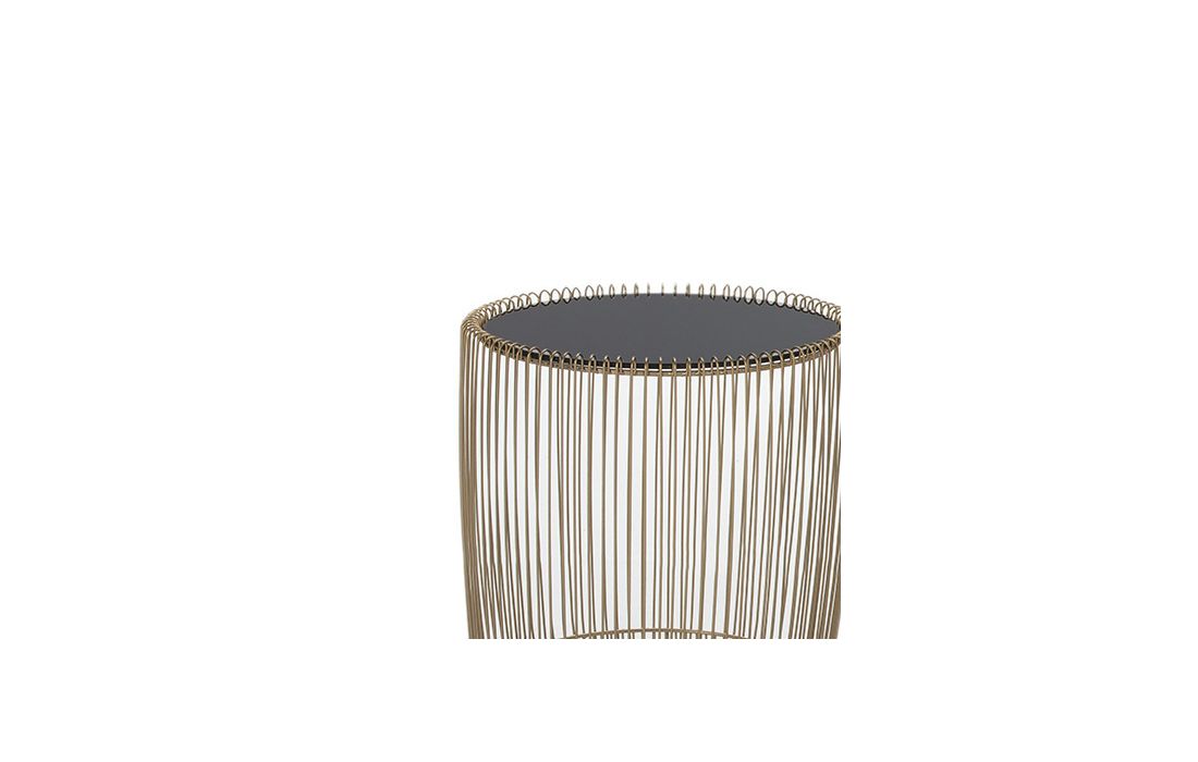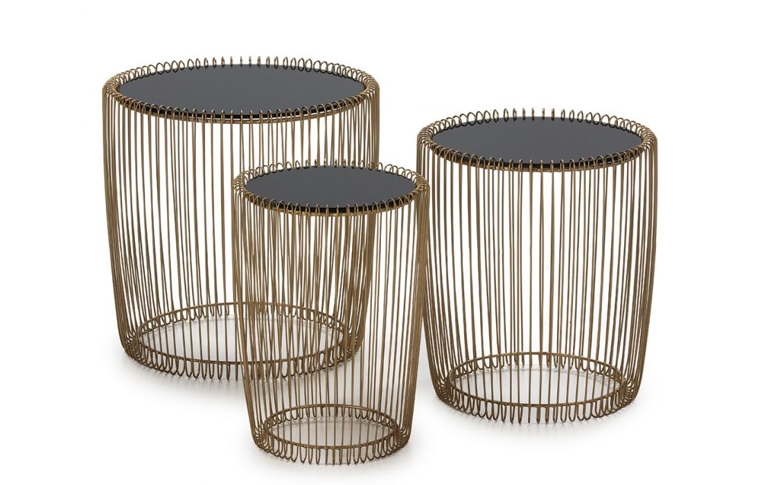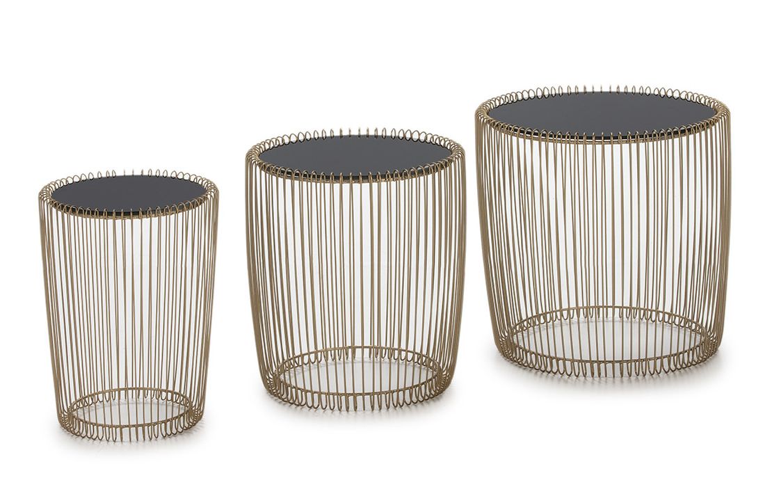 Conjunto 3 mesas de apoio com estrutura de metal dourado e tampo em vidro preto