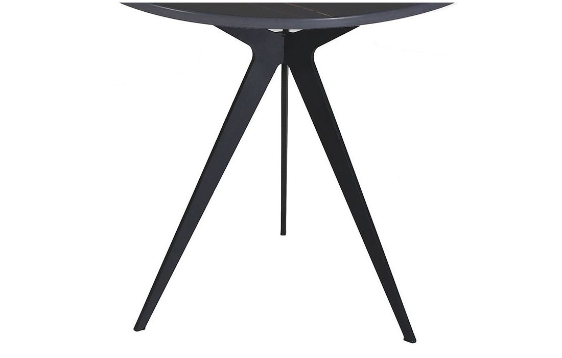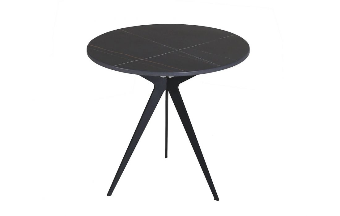 Mesa de apoio redonda com tampo em pedra sinterizada e pés em metal com acabamento preto mate.