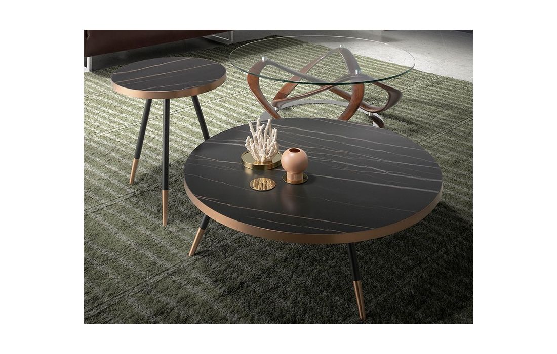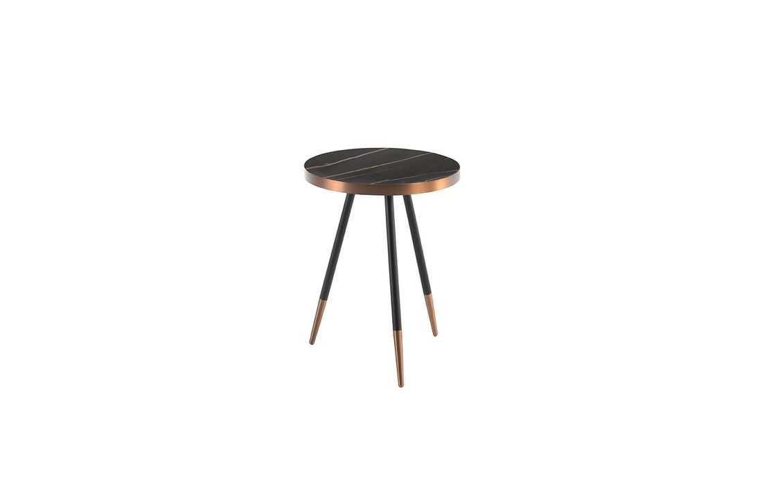 Mesa de apoio redonda com tampo em porcelana com acabamento mármore preto e pés em aço com banho cromado na cor bronze.