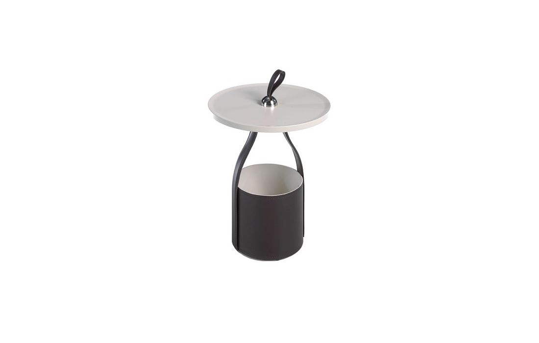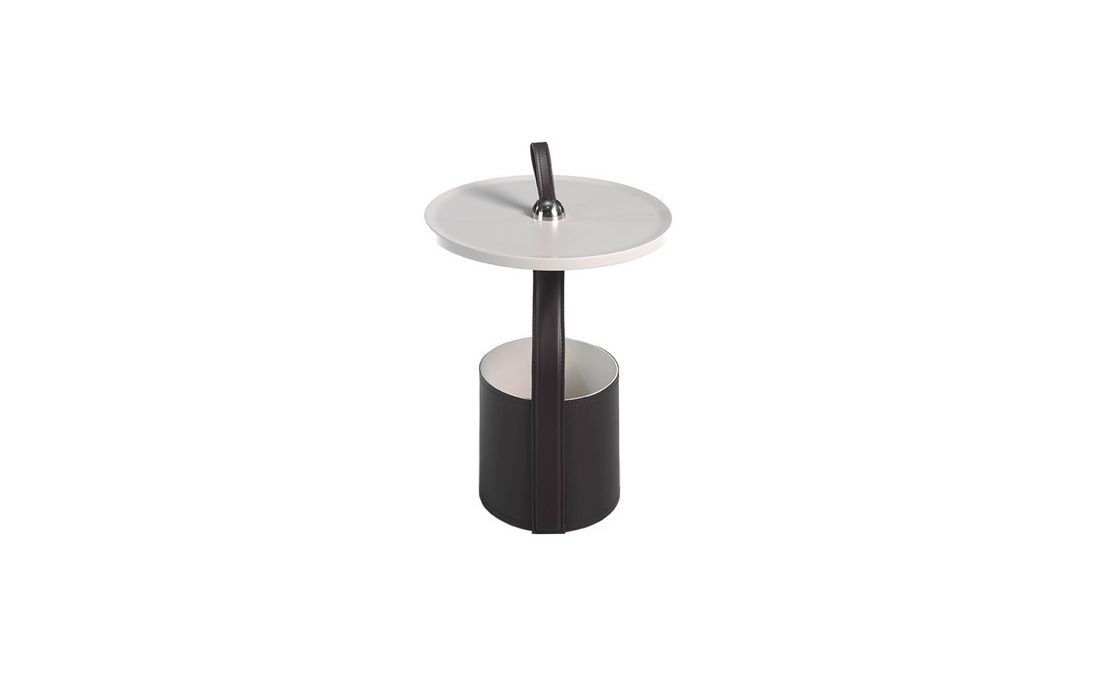 Mesa de apoio redonda em madeira cor de areia e base em couro sintético castanho chocolate