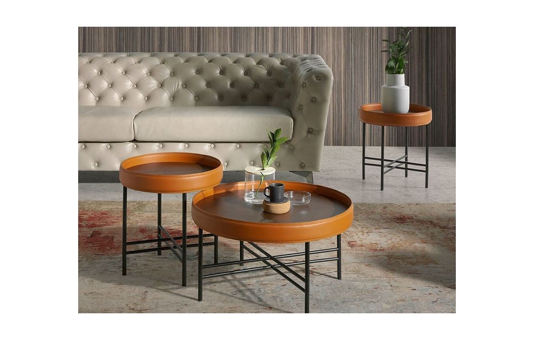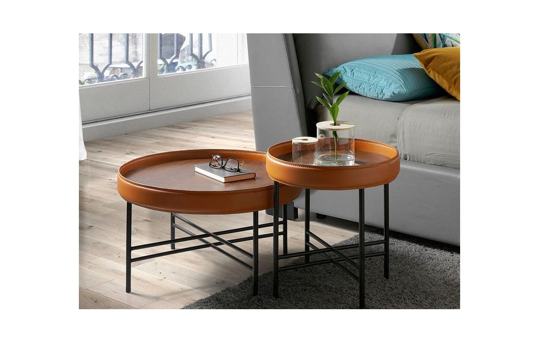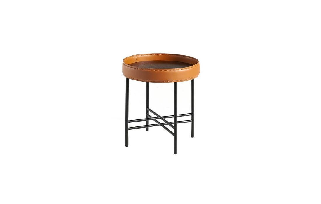 Mesa de apoio redonda com tampo de madeira folheado a nogueira e aro circular estofado em couro reciclado. Estrutura das pernas em aço preto.