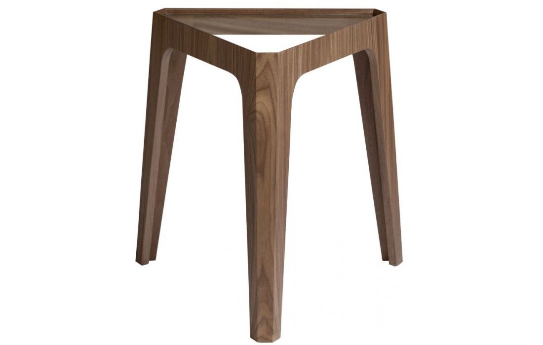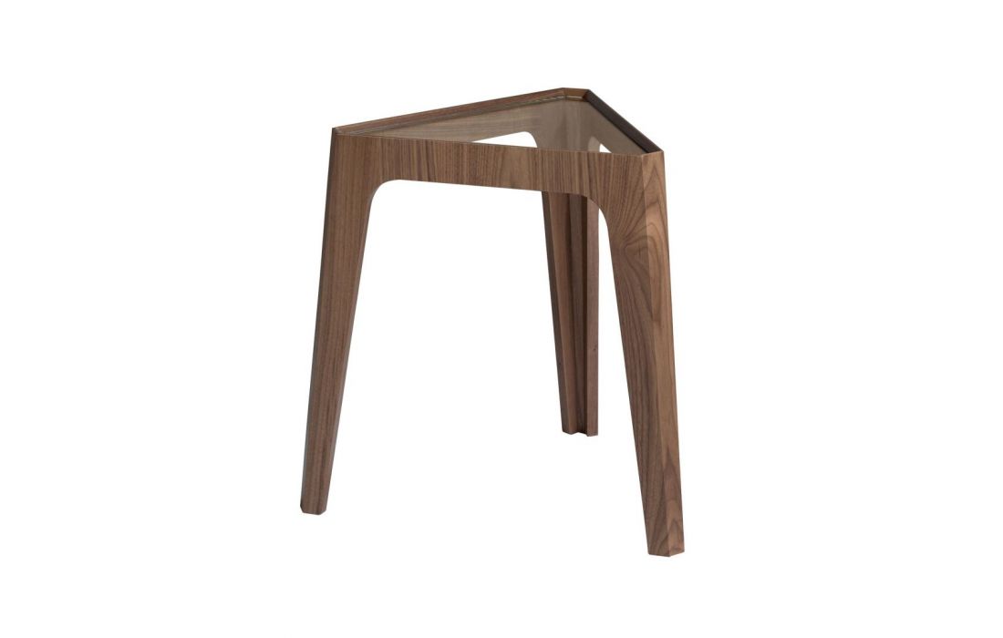 Mesa de apoio triangular de design moderno com tampo em vidro temperado e pernas em MDF de nogueira naturalDestinatário :
