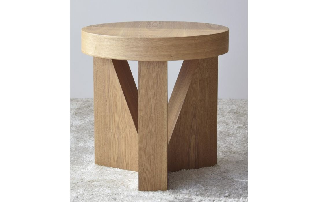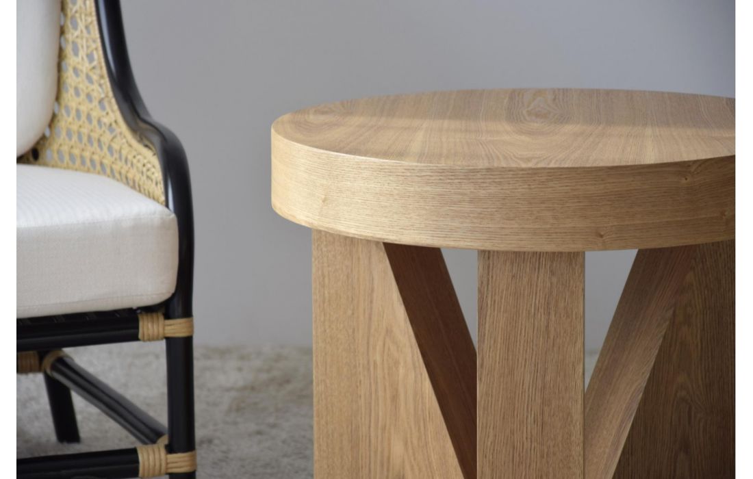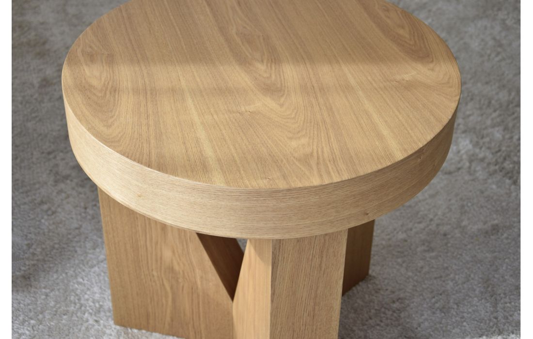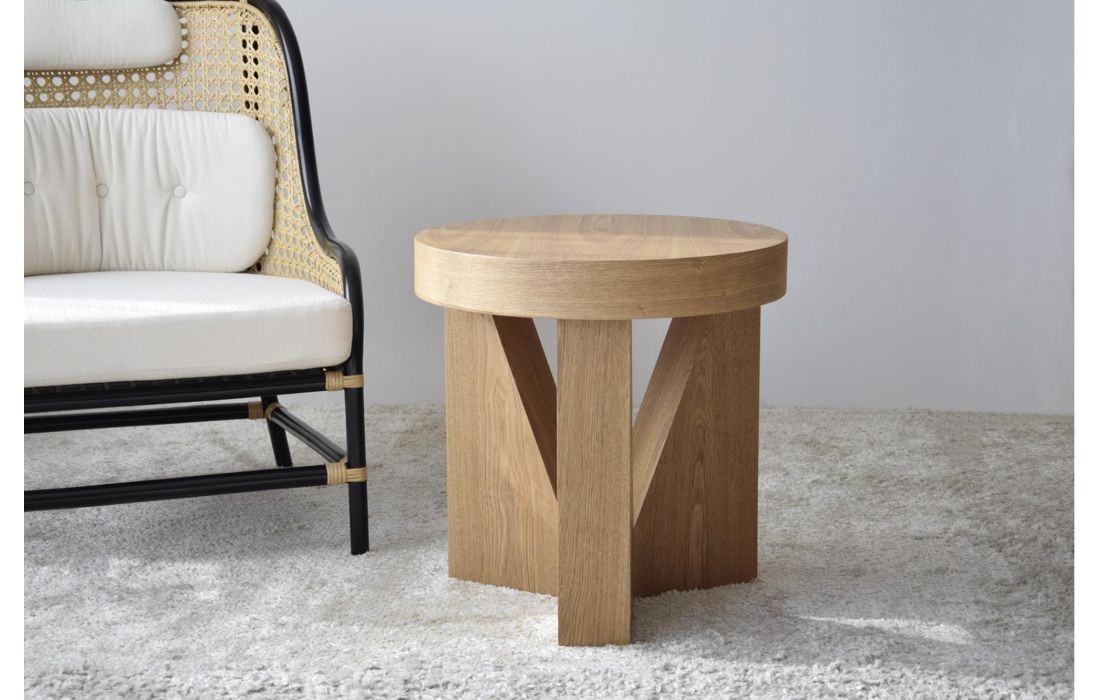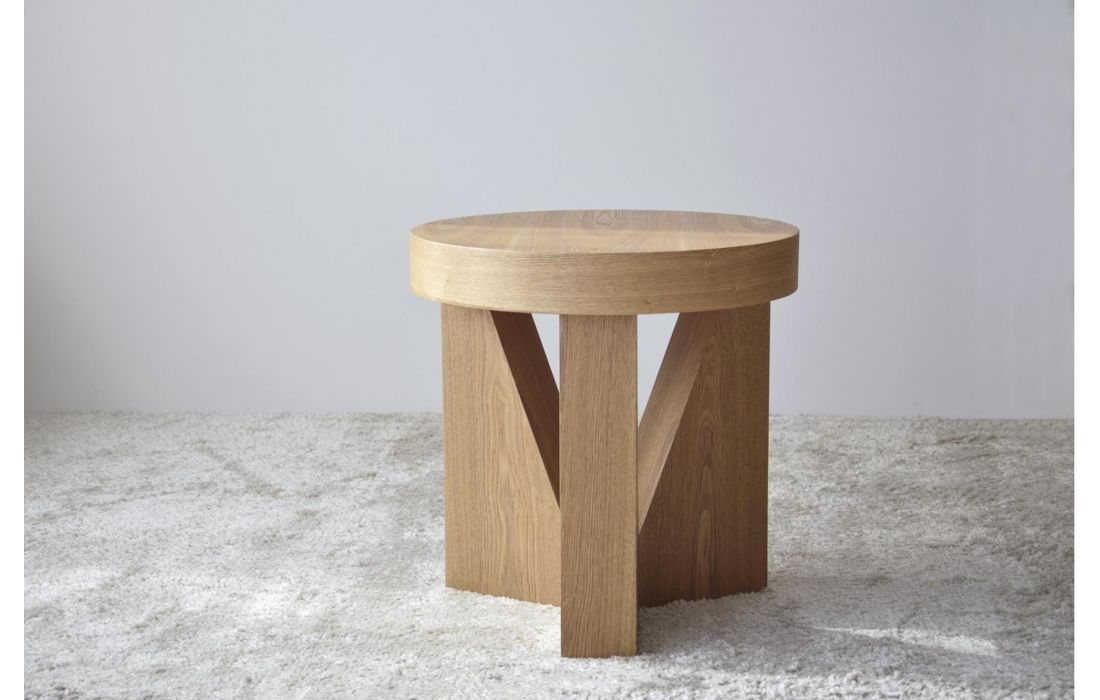 Mesa de apoio em MDF folheado a madeira natural de freixo com acabamento natural. A base é formada por três peças triangulares que contrasta com a curva do tampo.