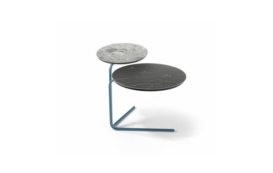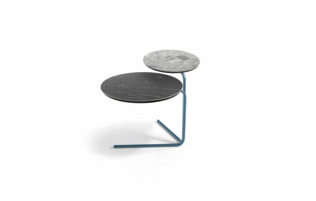 Mesa de apoio com dois tampos circulares em cerâmica e pés em metal