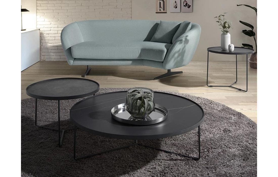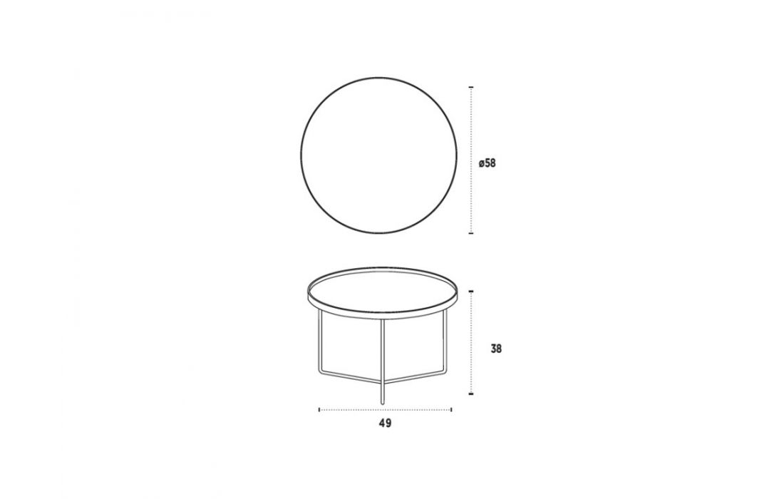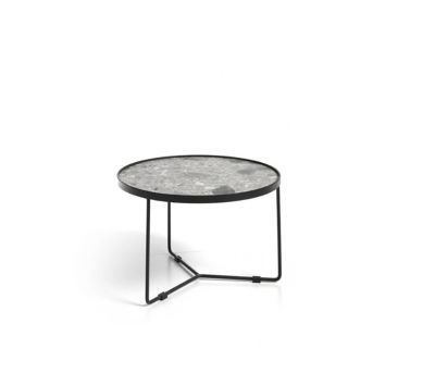 Mesa de apoio com tampo em cerâmica e pé em metal.
