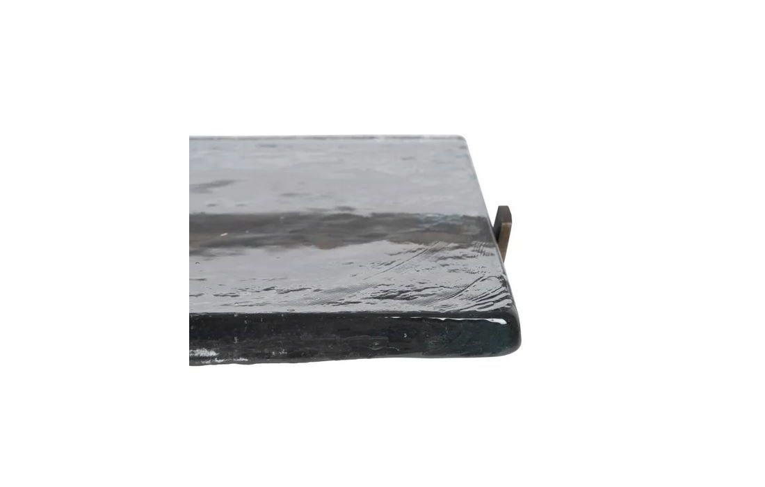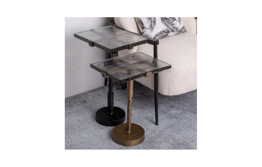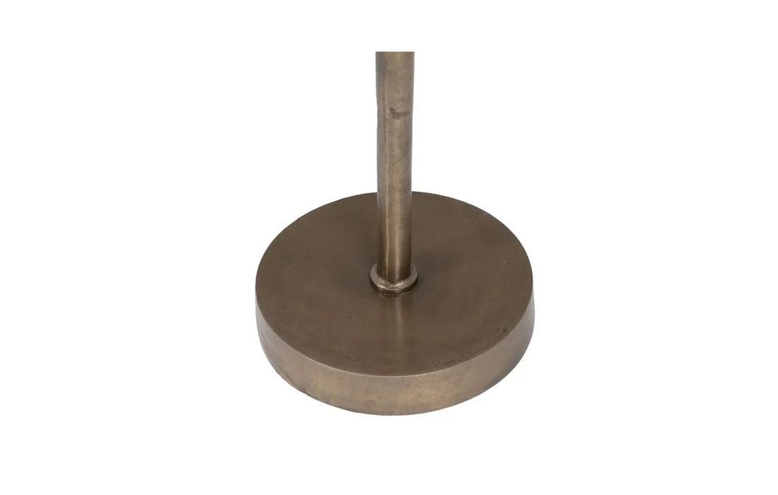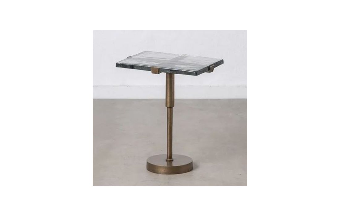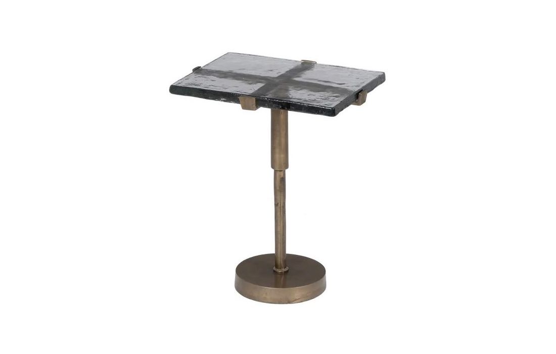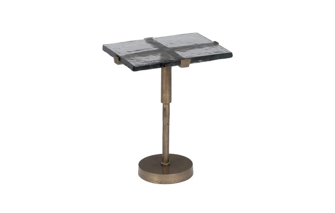 Mesa de apoio com estrutura em metal dourado envelhecido e tampo de vidro