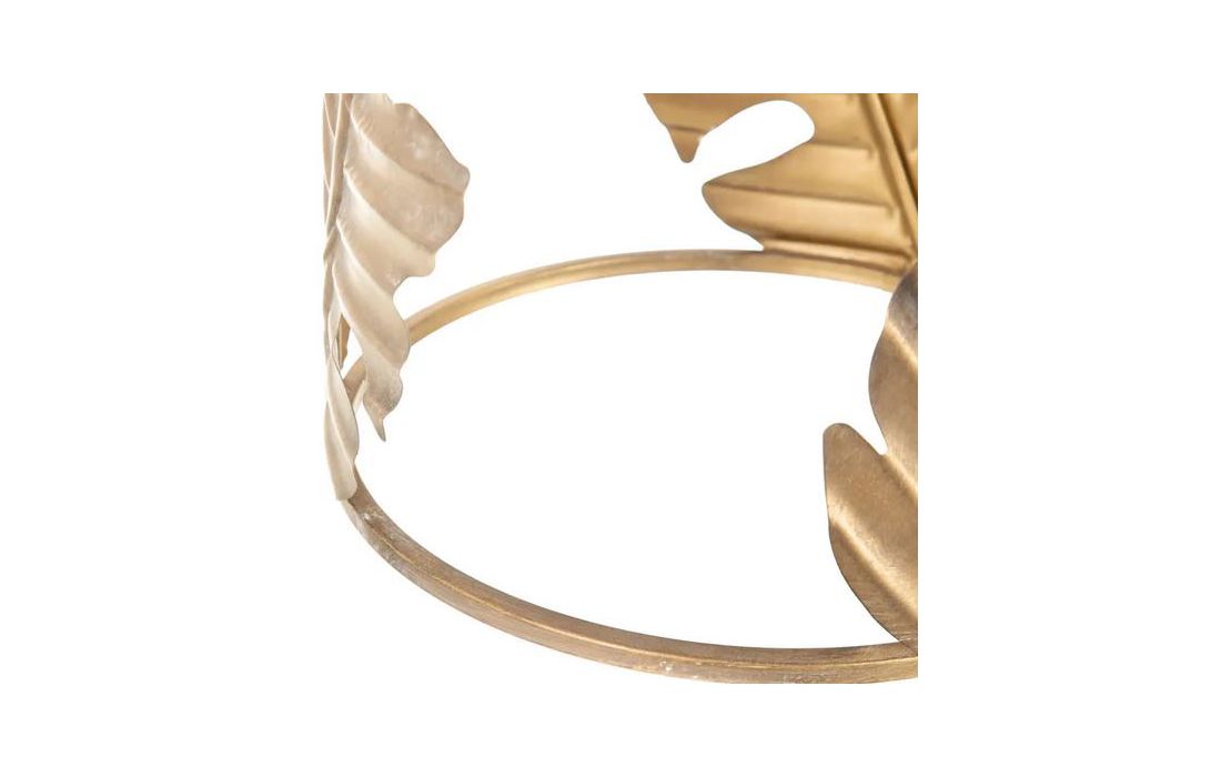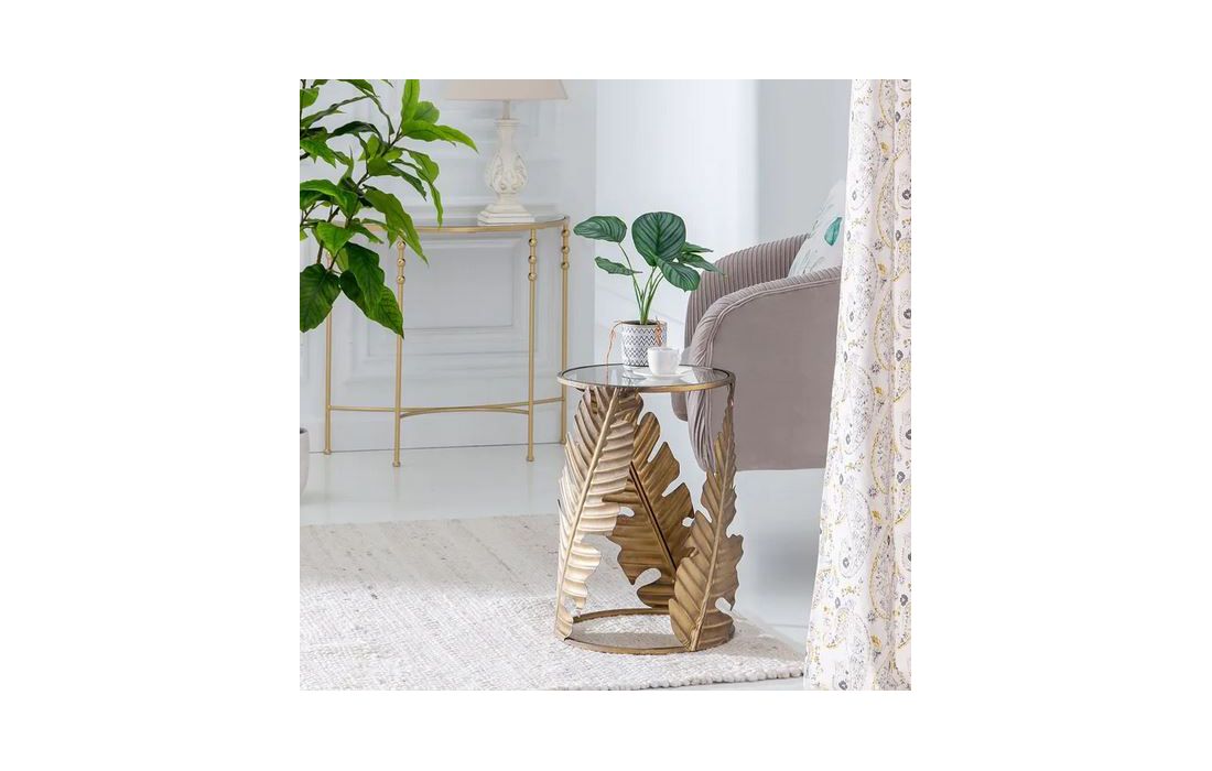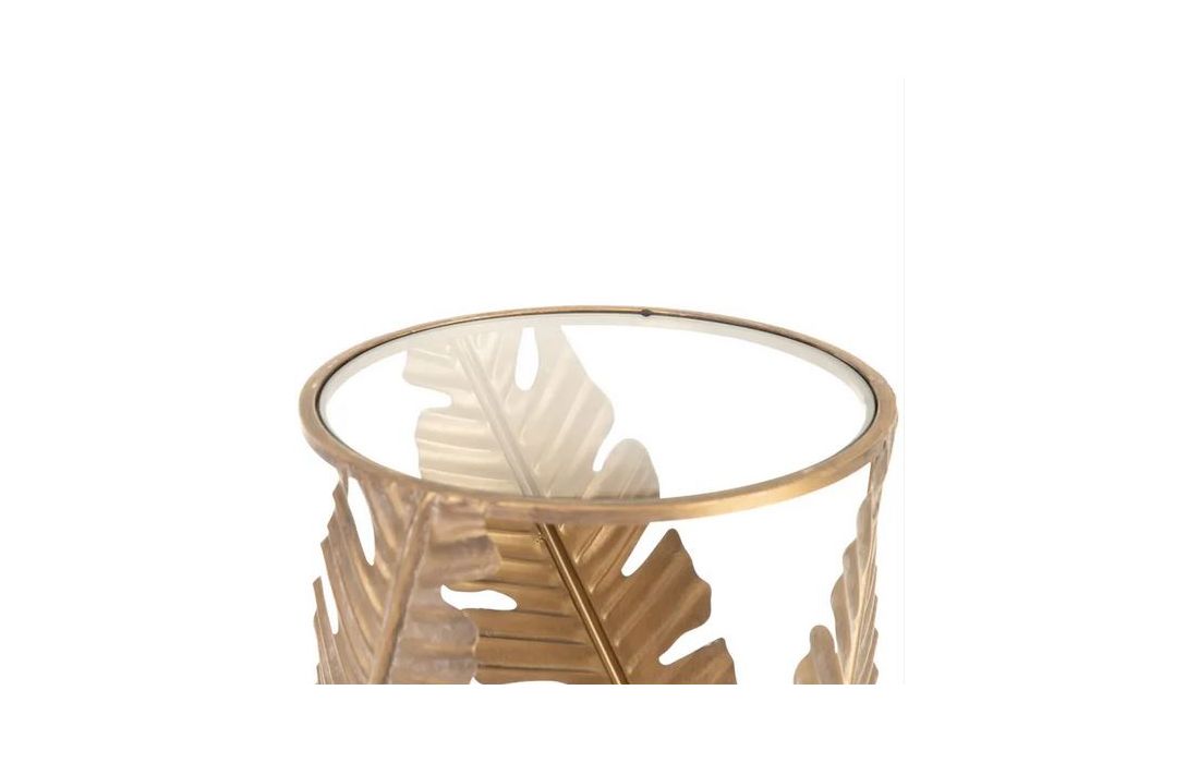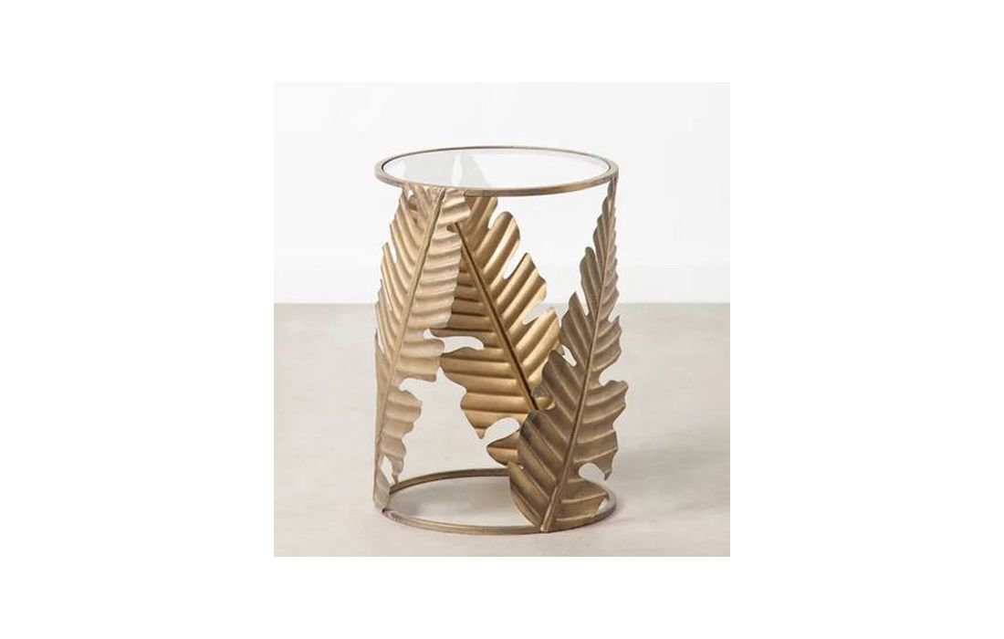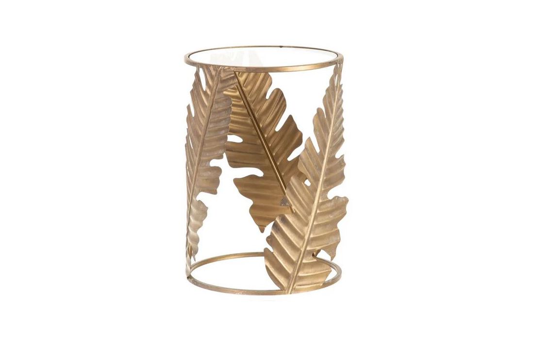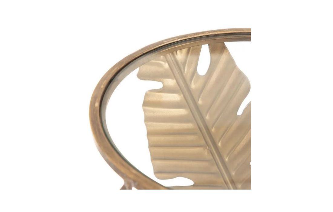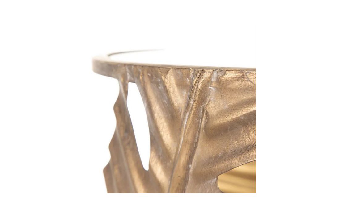 Mesa de apoio em metal dourado envelhecido e tampo de vidro