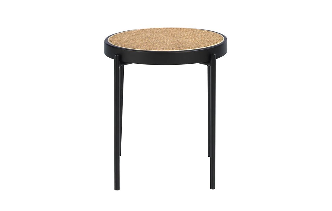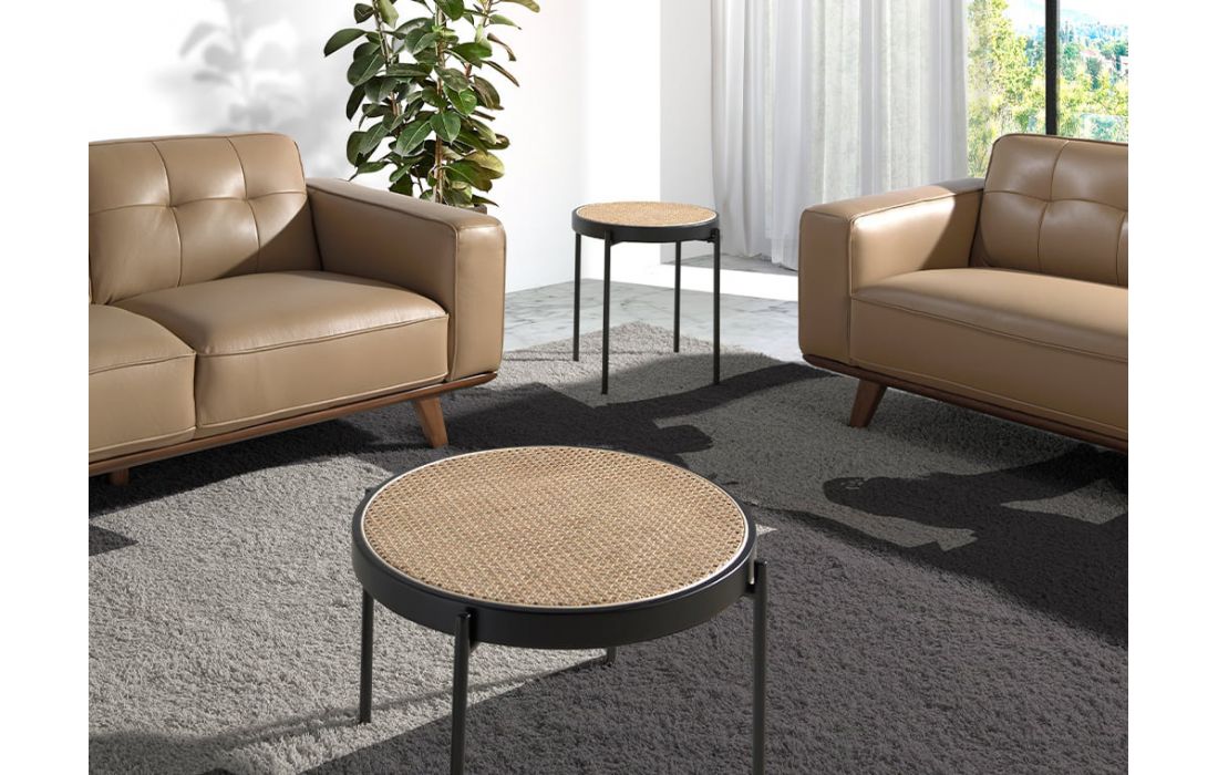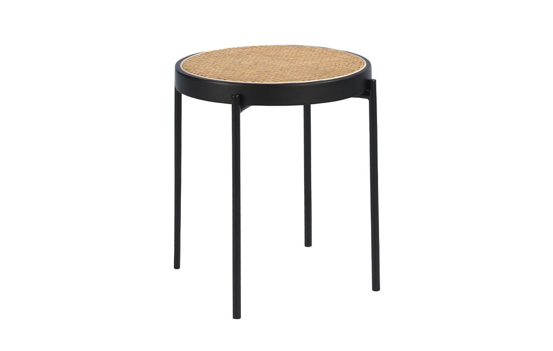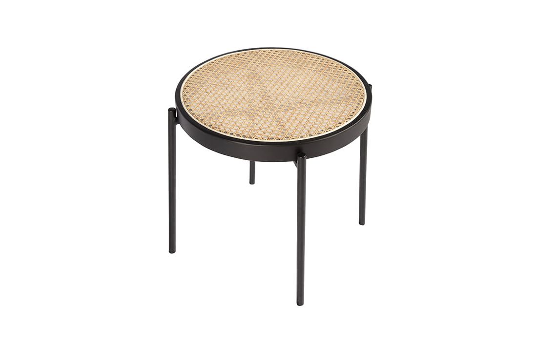 Mesa de apoio de design moderno feita de MDF, um elegante tampo de palhinha e pernas em aço inoxidávelDestinatário :