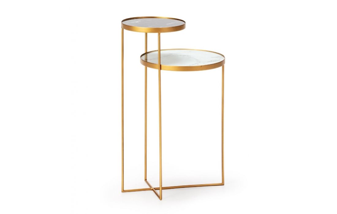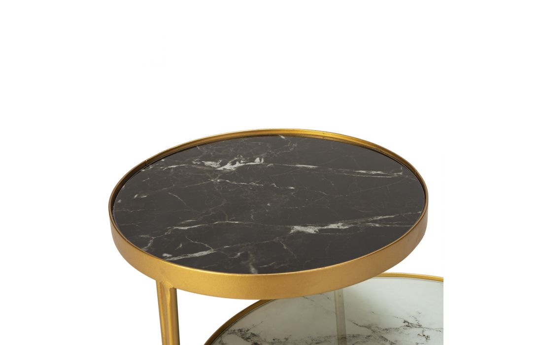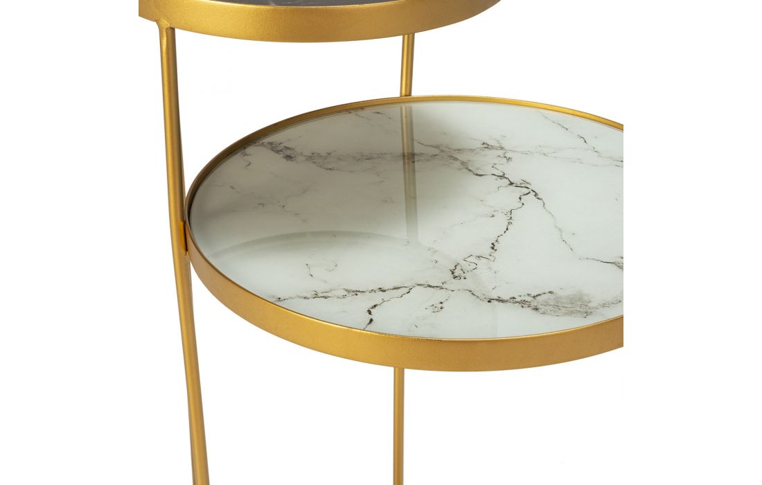 Mesa de apoio com estrutura em metal com tampos em vidros em imitação de mármore.Destinatário :