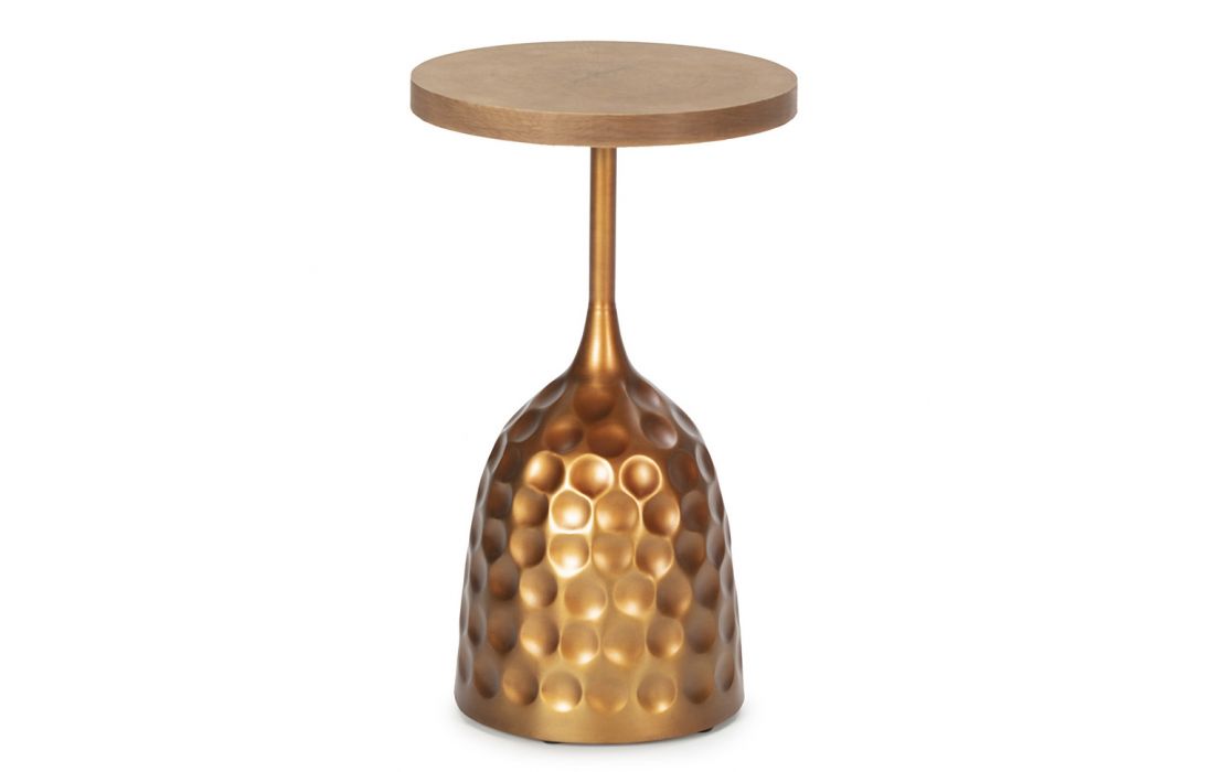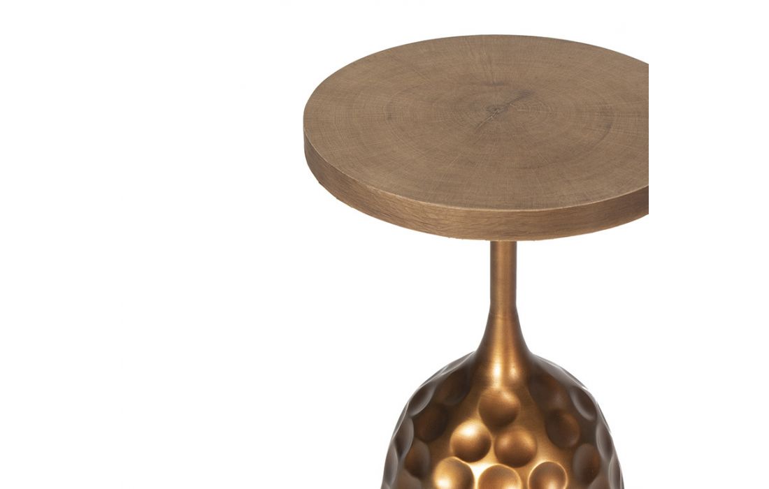 Mesa de apoio com estrutura em metal dourado e tampo de madeira natural