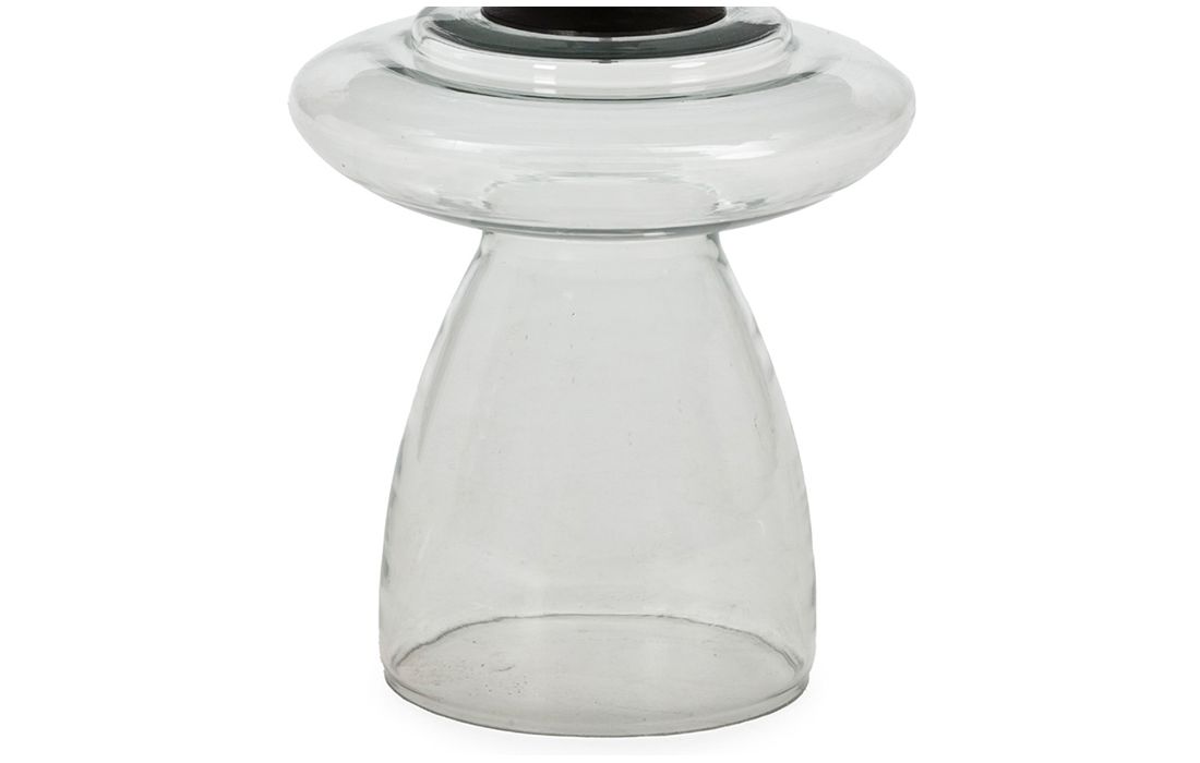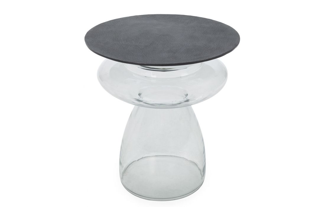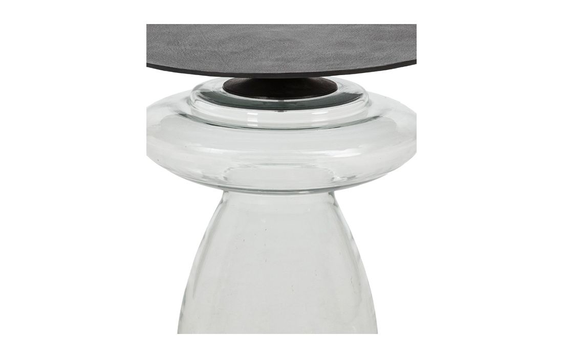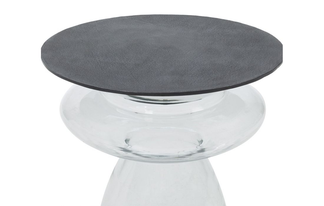 Mesa de apoio redonda com estrutura de vidro transparente e tampo em metal cor bronze envelhecido