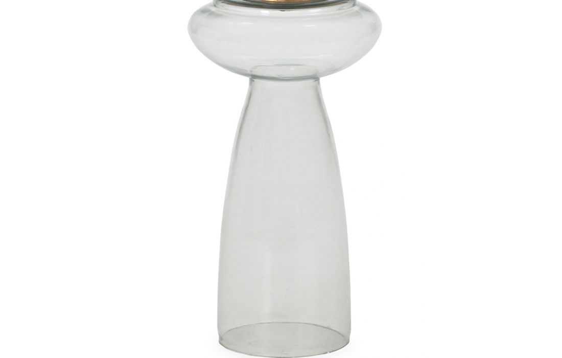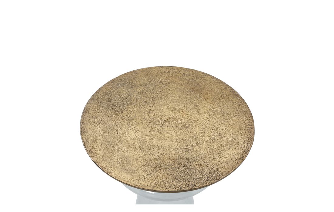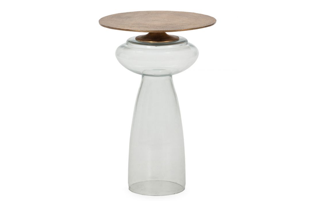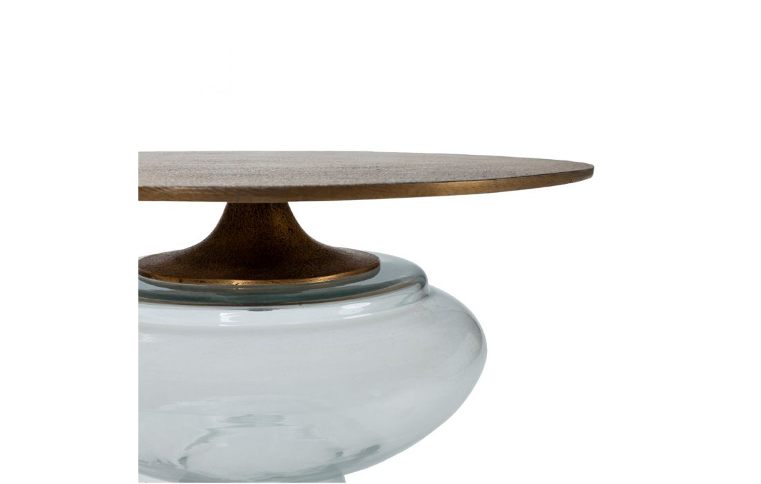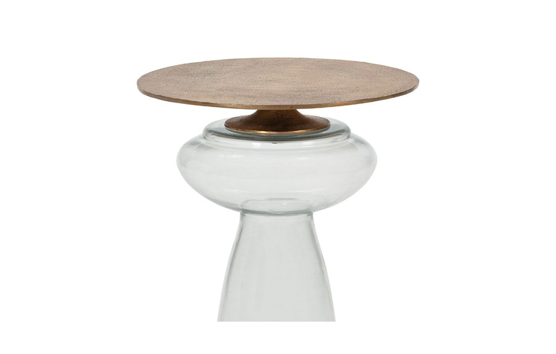 Mesa de apoio redonda com estrutura de vidro transparente e tampo em metal cor dourado envelhecido
