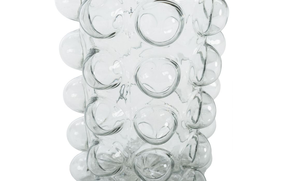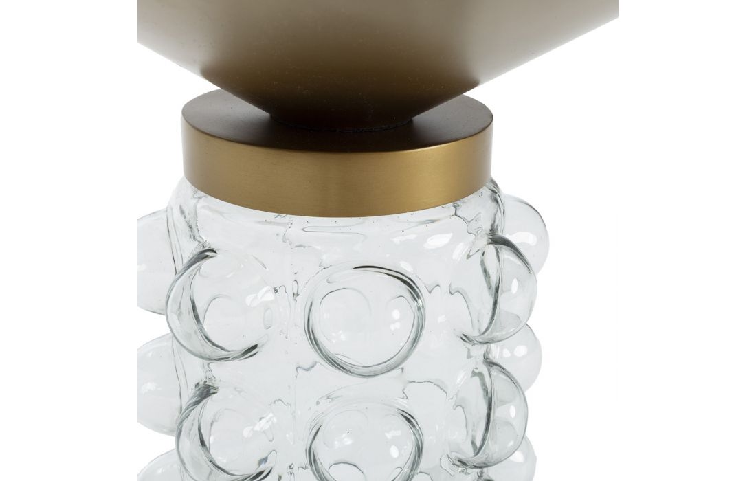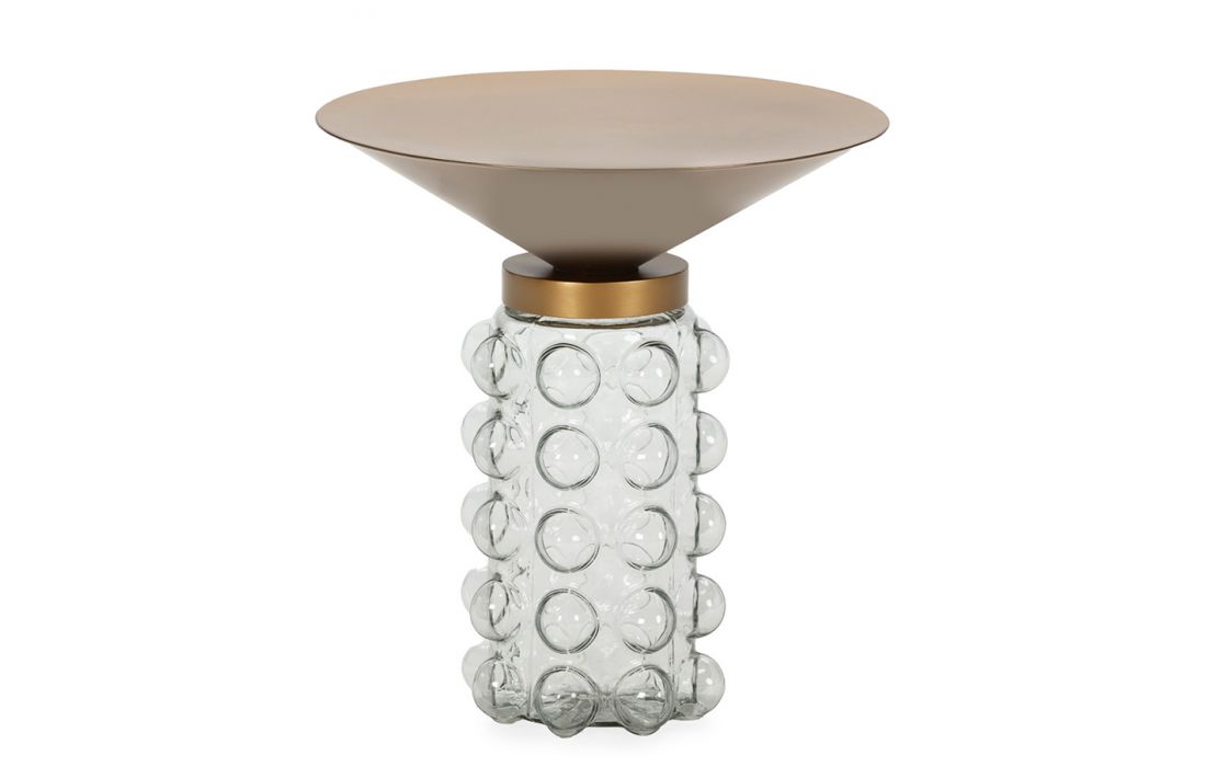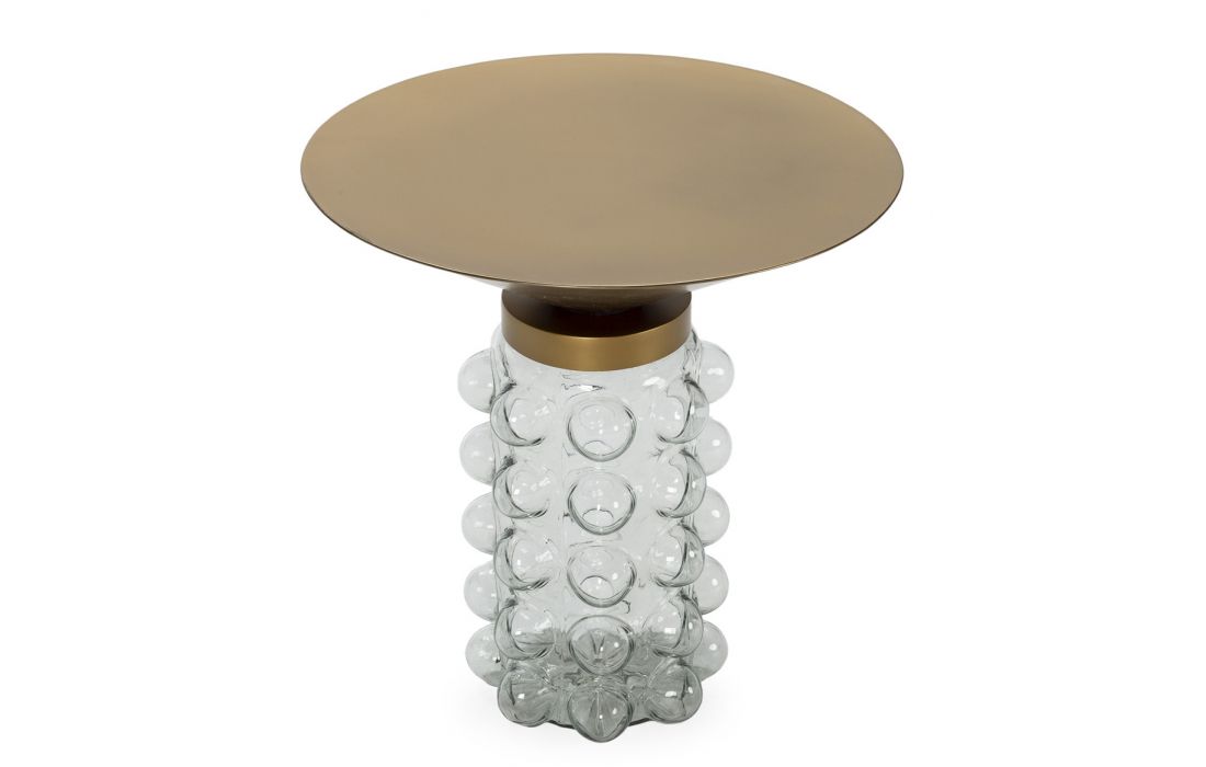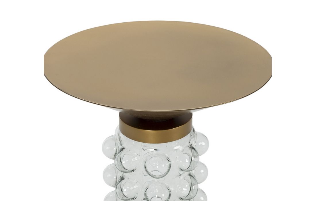 Mesa de apoio redonda com estrutura de vidro transparente e tampo em metal dourado
