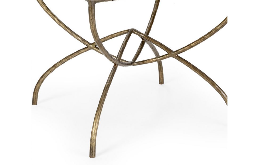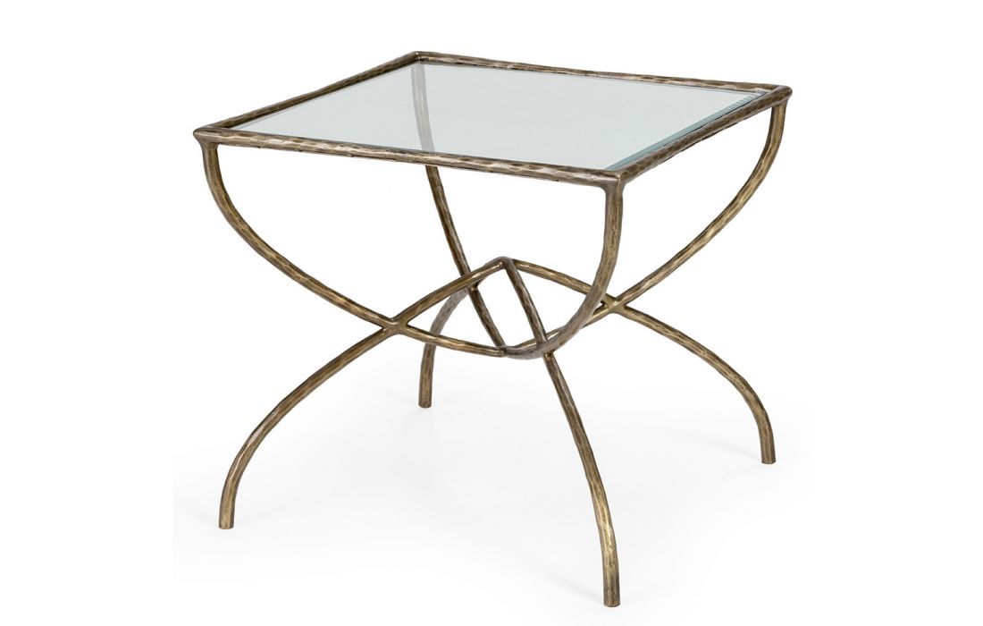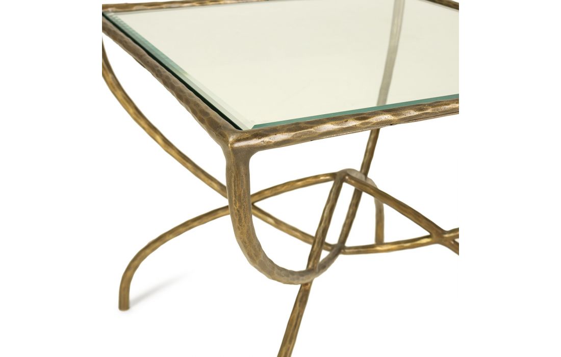 Mesa de apoio quadrada com estrutura em metal dourado envelhecido e tampo de vidro