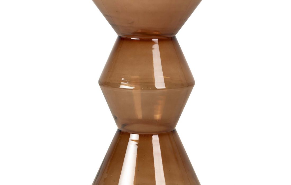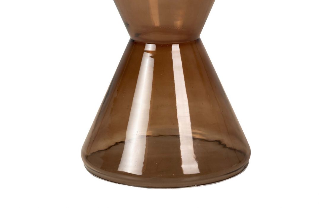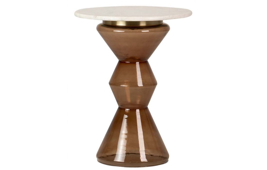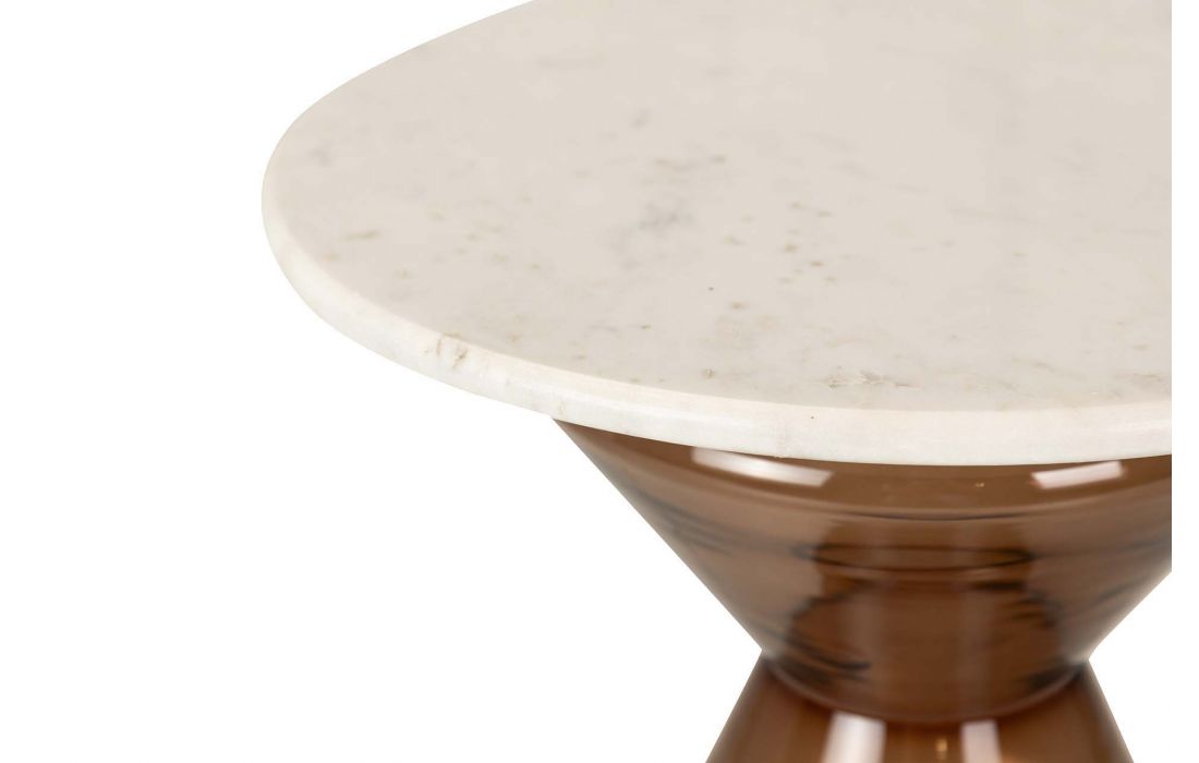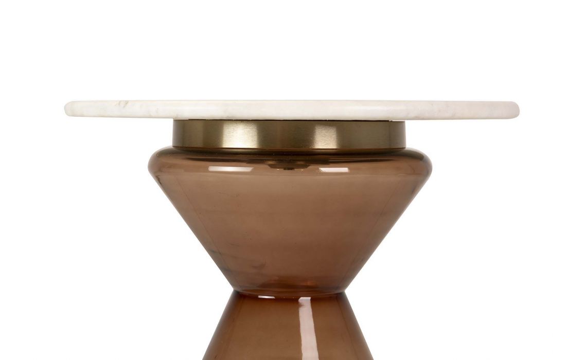 Mesa de apoio redonda com estrutura em vidro e metal cor castanho/dourado com tampo de marmore branco