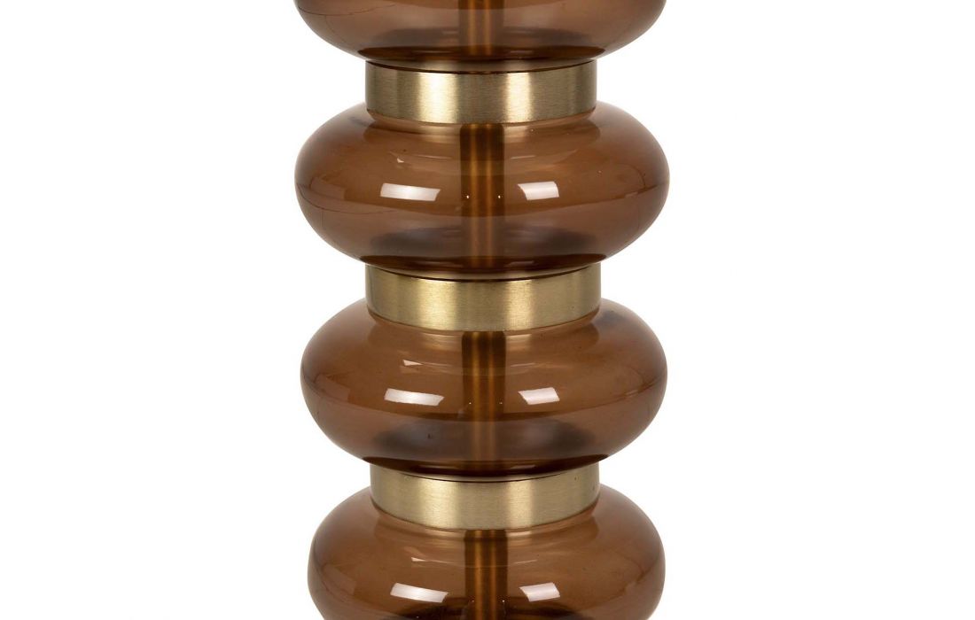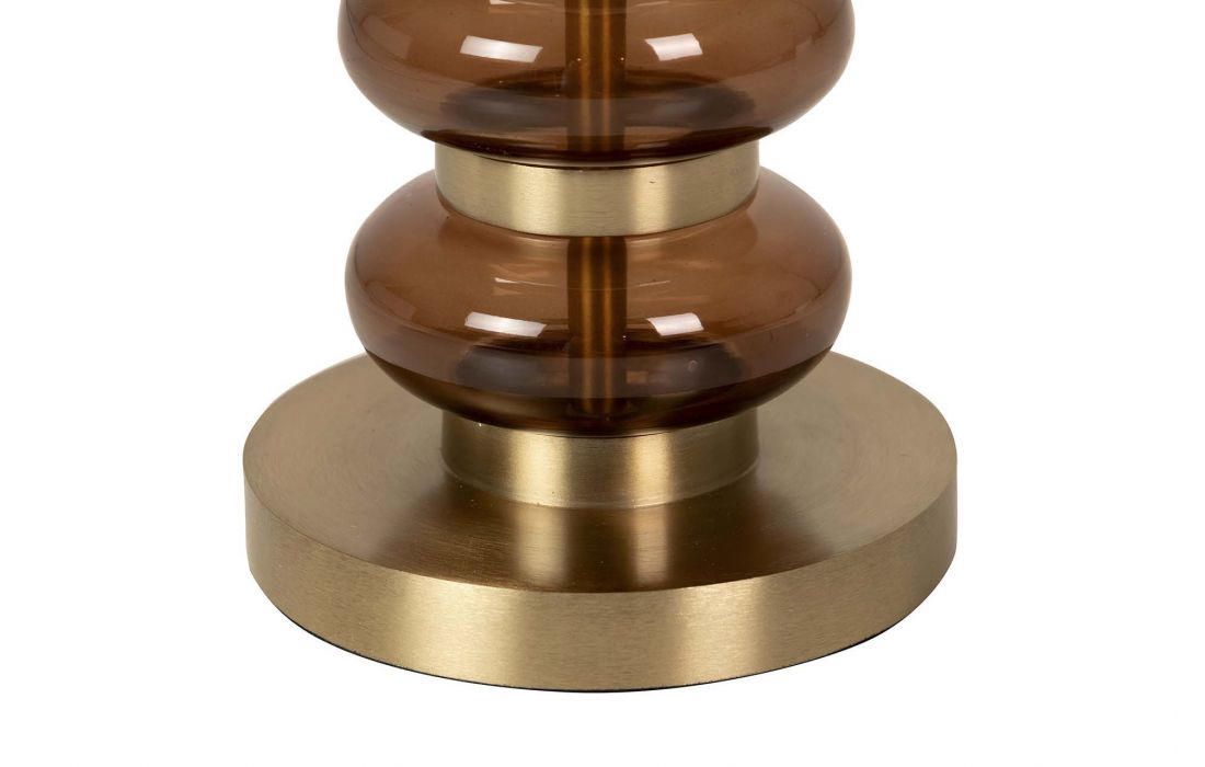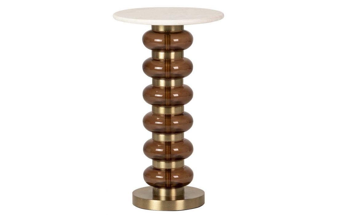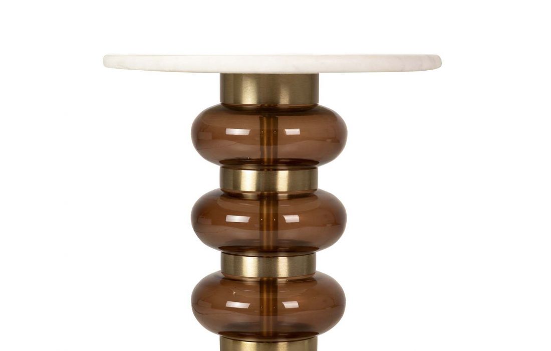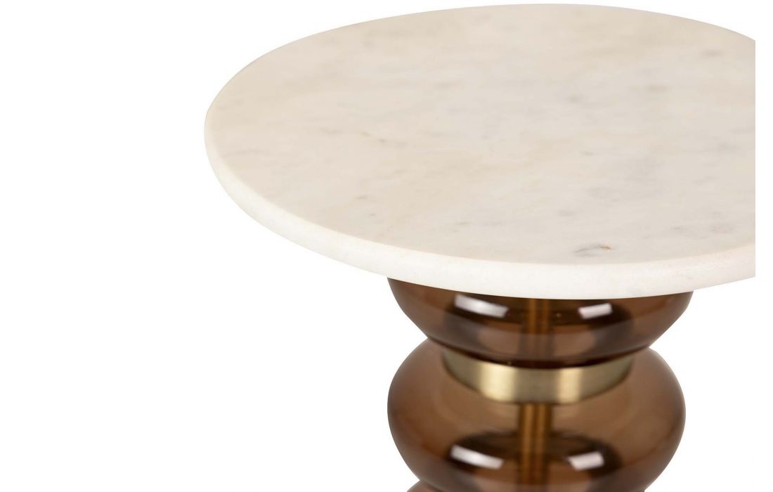 Mesa de apoio redonda com estrutura em vidro e metal cor castanho/dourado com tampo de marmore branco