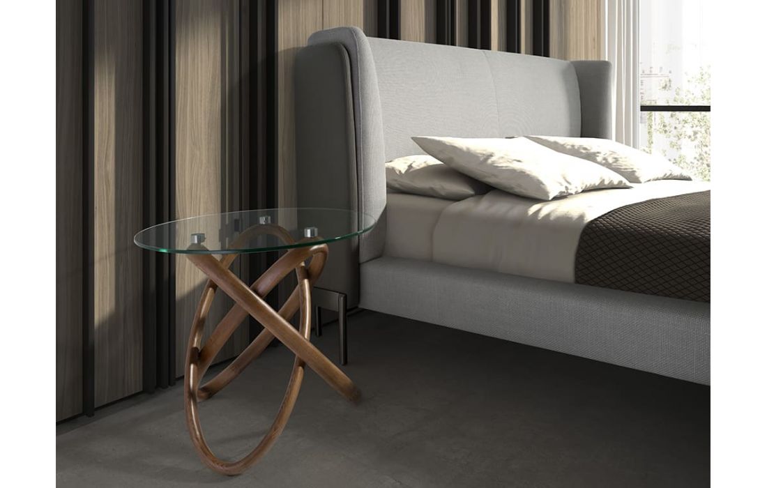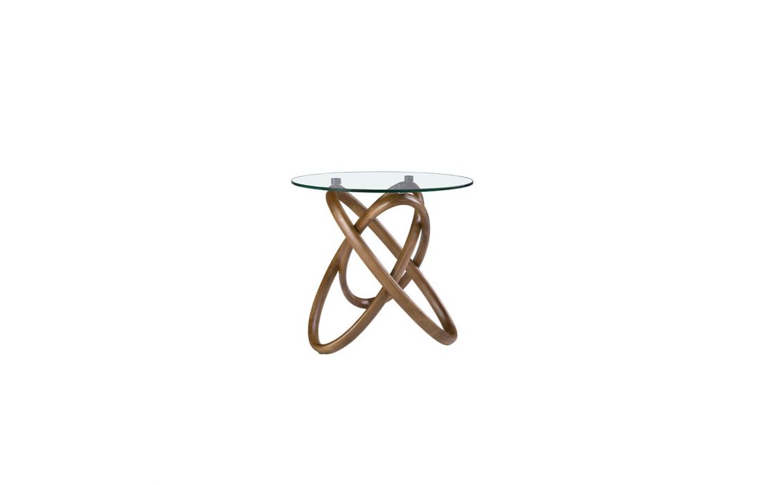 Mesa de canto redonda de design moderno com tampo de vidro temperado e pés em madeira cor de nogueira.Destinatário :
