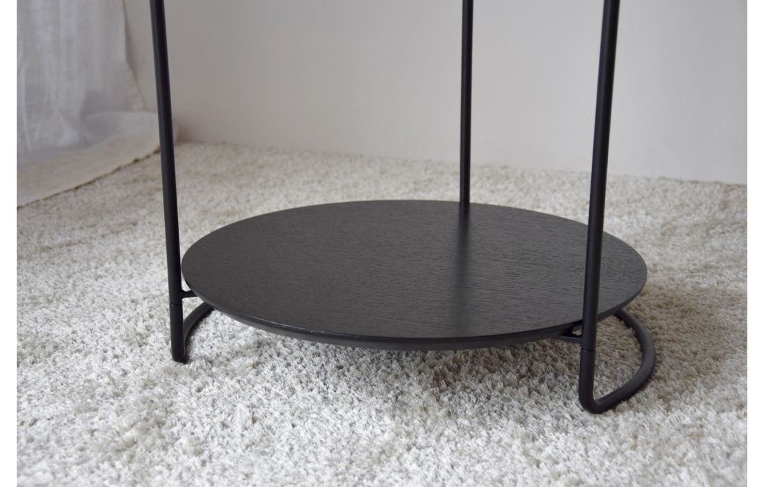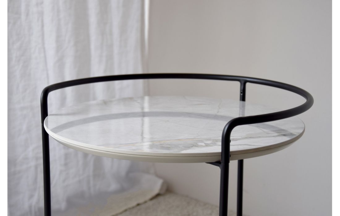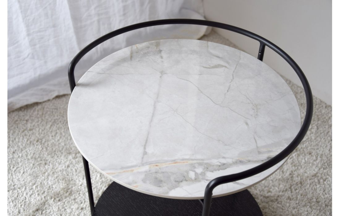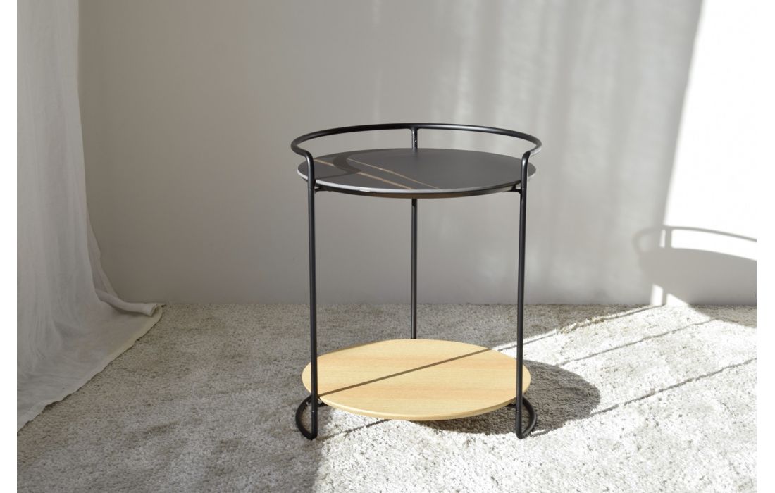 Mesa de apoio com tampo em cêramica, na parte inferior é madeira de carvalho natural. Pés em metal.Destinatário :