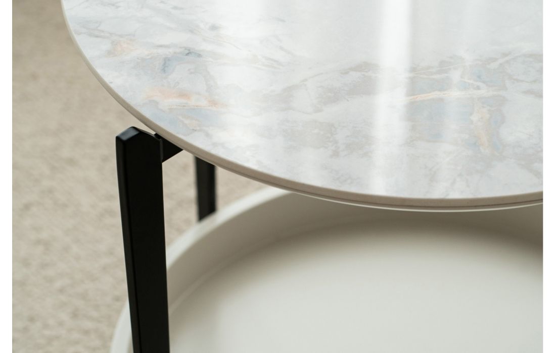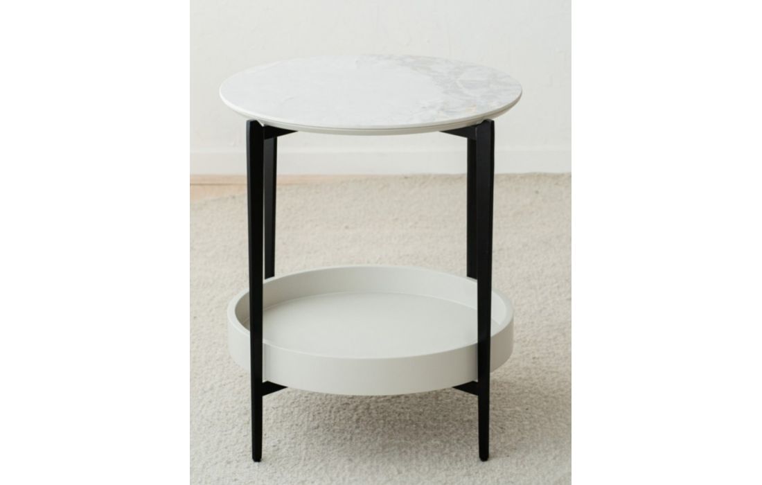 Mesa de apoio com pernas metálicas na cor preto fosco e tampo cerâmico na cor branco e cinza, bandeja inferior lacada na cor cinza areia foscoDestinatário :
