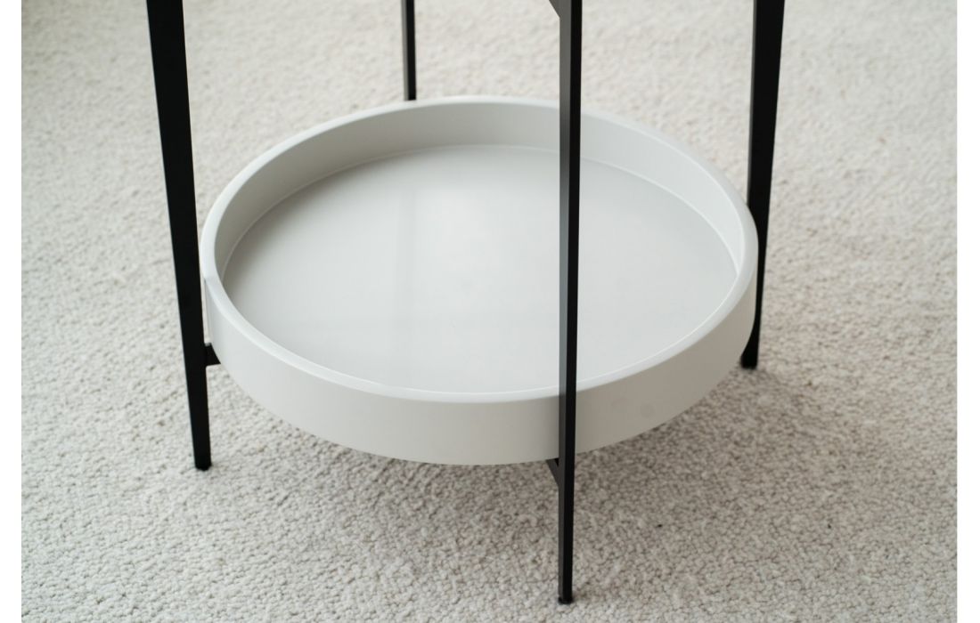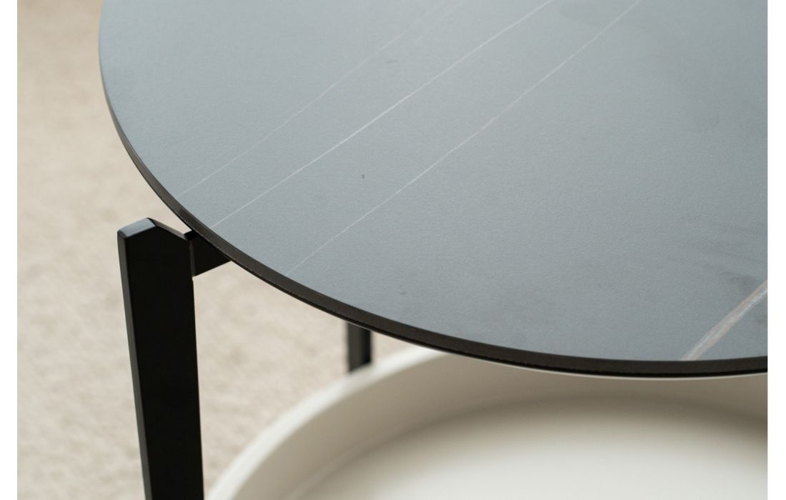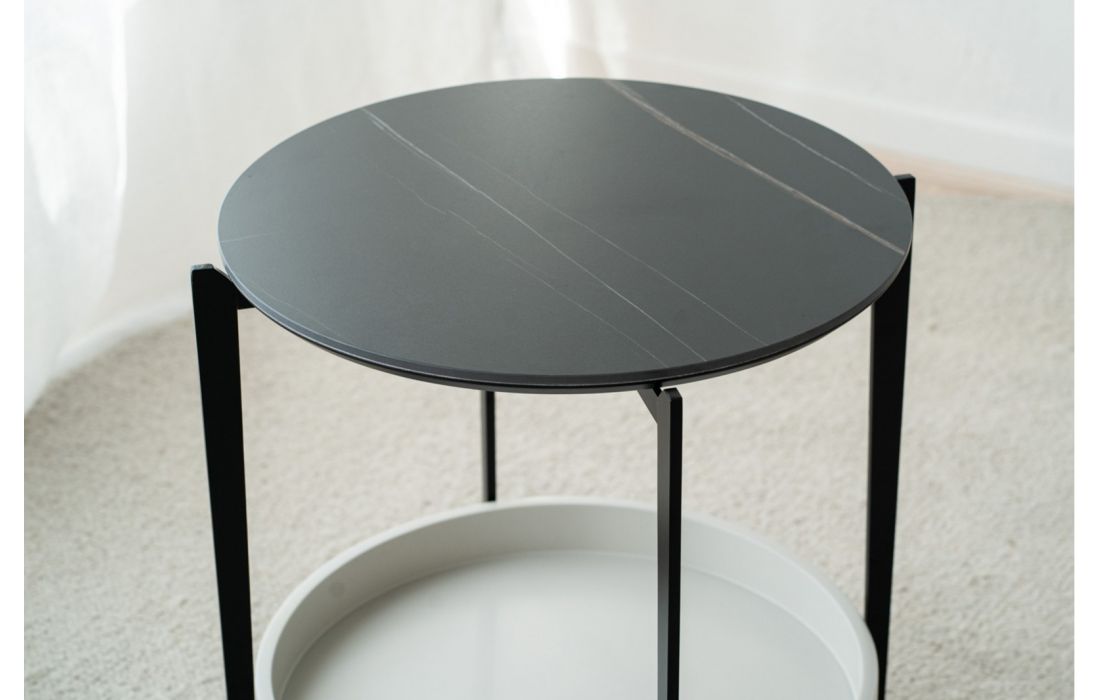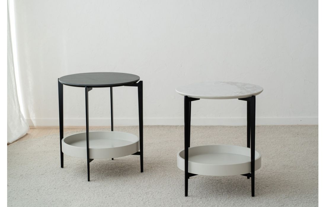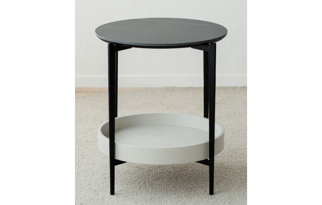 Mesa de apoio com pernas metálicas na cor preto fosco e tampo cerâmico na cor preto e ocre , bandeja inferior lacada na cor cinza areia foscoDestinatário :
