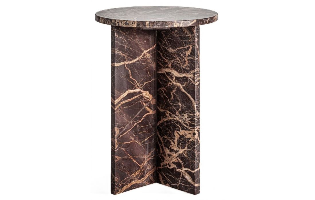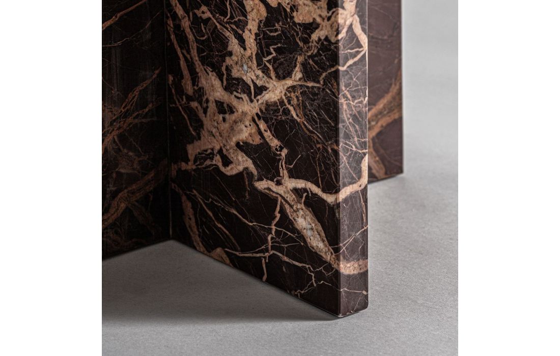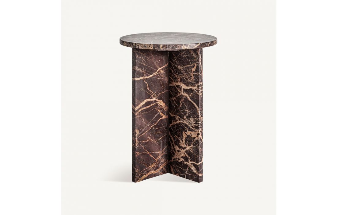Mesa de apoio fabricada em mármore escuro com veios dourados, a sua estrutura arqueada cria um jogo visual delicado e equilibradoDestinatário :