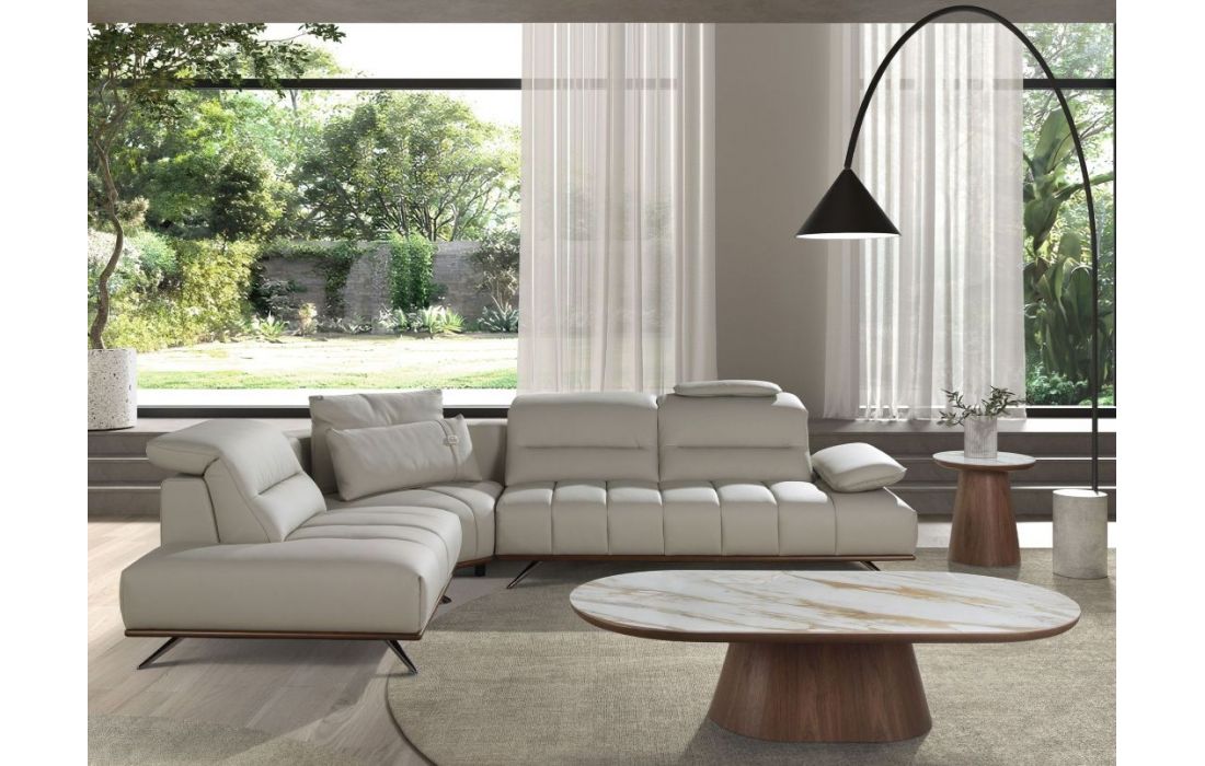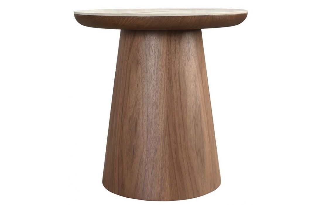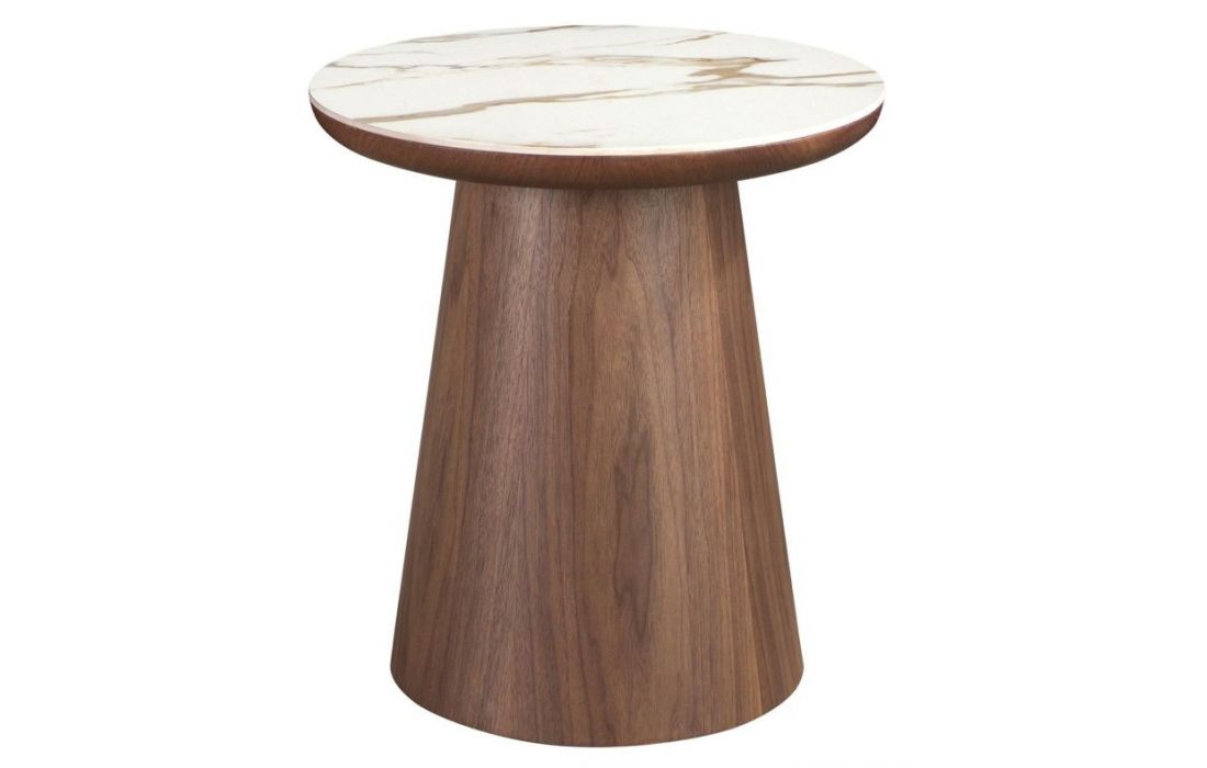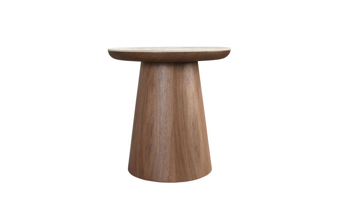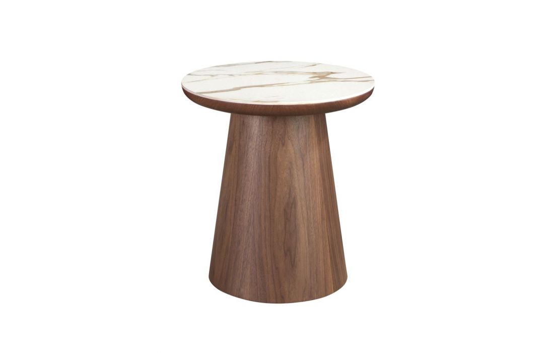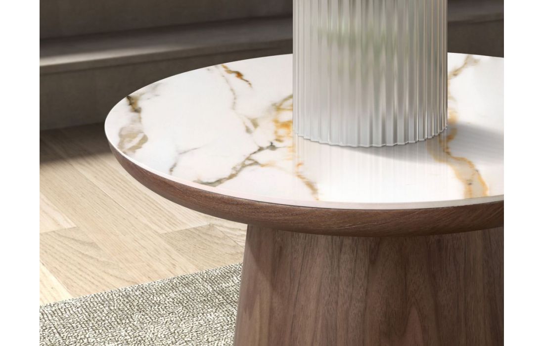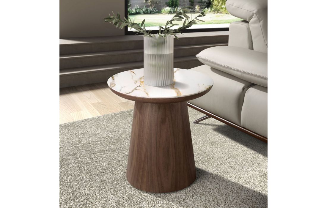 Mesa de canto redonda moderna com acabamento brilhante em porcelana e pés originais em folheado de nogueiraDestinatário :