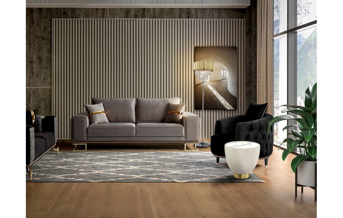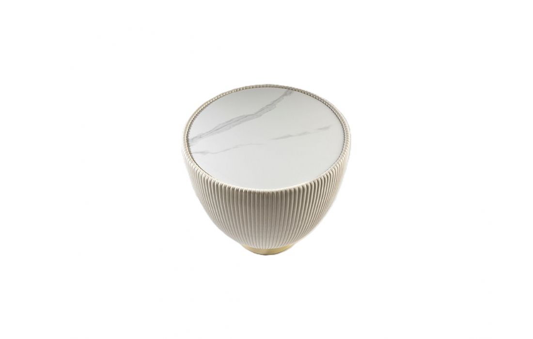Mesa de apoio redonda, estofada em polipele plissada, base metálica com acabamento em latão e tampo em pedra sinterizadaDestinatário :